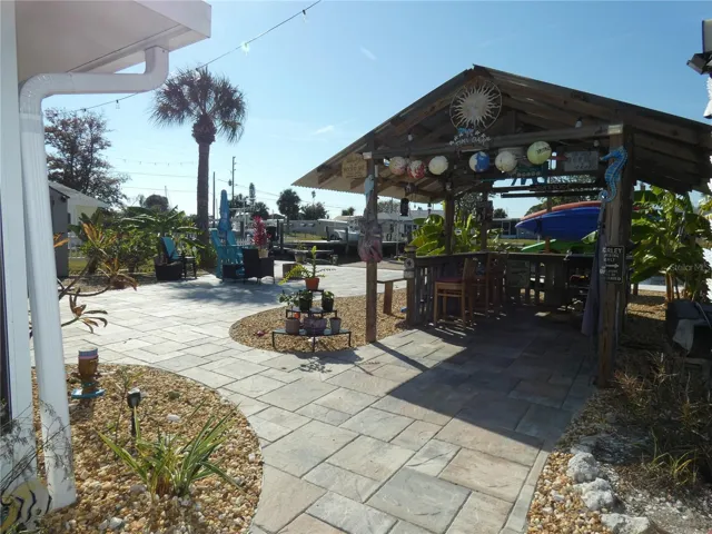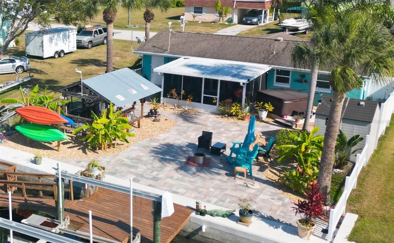 This unique and very friendly Community with NO HOA also has the option of going out joy riding on your golf cart to nearby events and entertainment while enjoying the beautiful weather. This fully remodeled 2 bedroom, 1 bath, 1 car garage Coastal Gem with screened in Florida Room is full of excitement and meticulously maintained! New elevated AC 2025, Water heater 2022, Roof 2014 (great condition), all new kitchen appliances and countertops/cabinets 2025, new bathroom vanity and bath tub/tile 2025, new pavers, drainage and seawall cap 2024, all new PGT Hurricane windows w/warranty along with Faux wood window blinds 2025, new doors/frames 2025, Eastern Architectural Hurricane front and back doors 2025, 6 person hot tub 2022, new gray water pump 2022, 8’x7’shed 2020, fresh exterior paint 2020 and tamper resistant electrical outlets 2025. All work performed was completed with permits.
