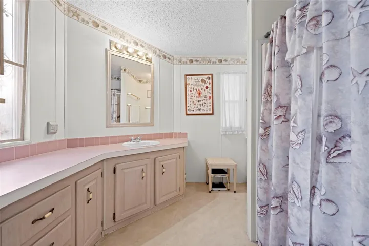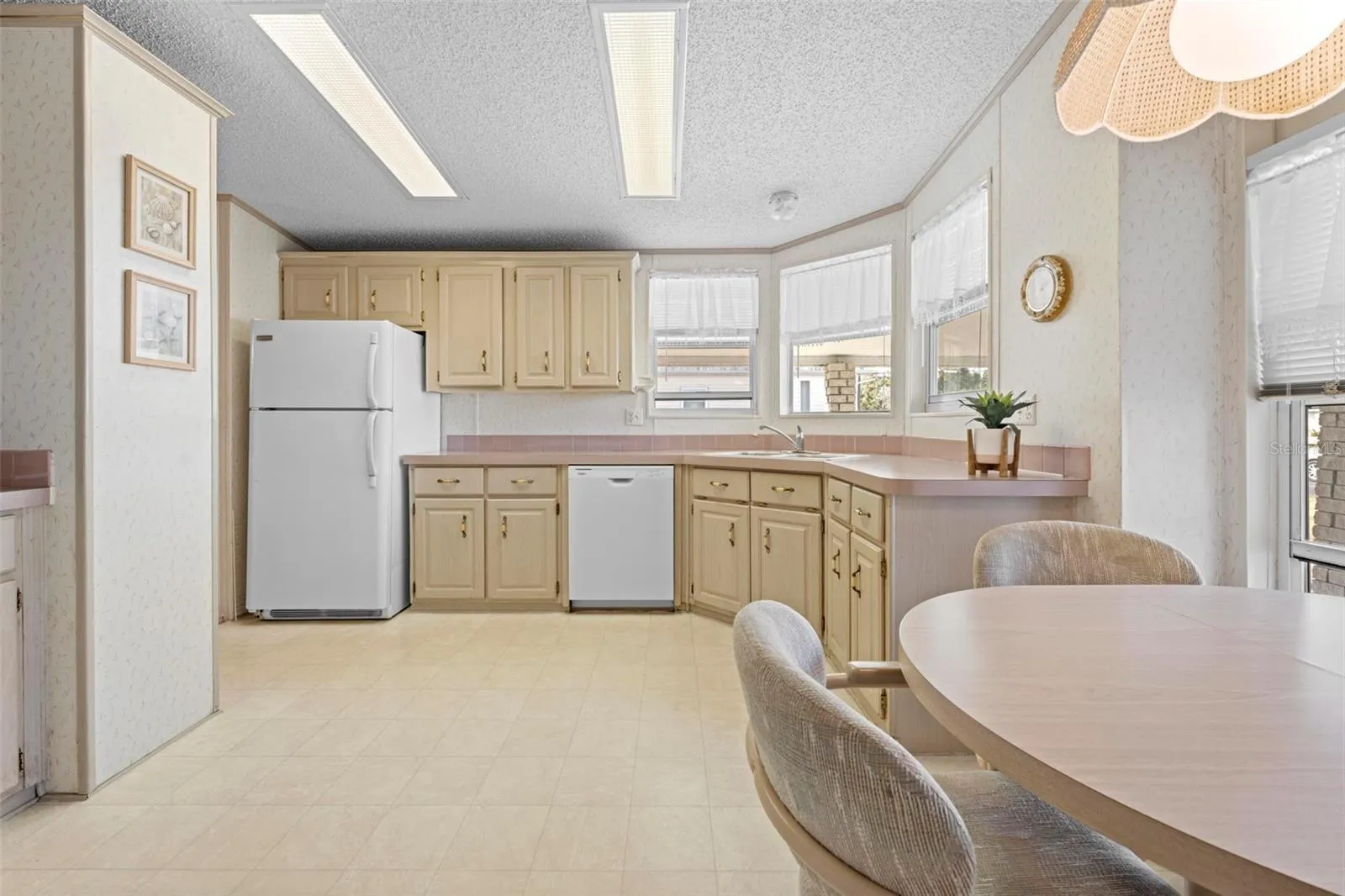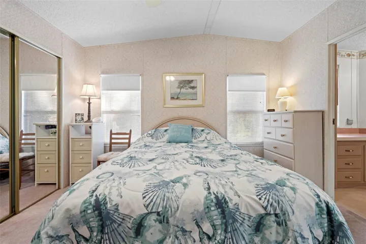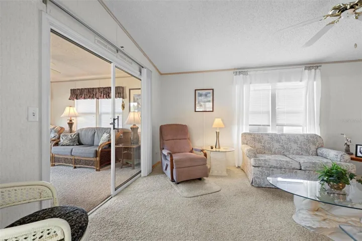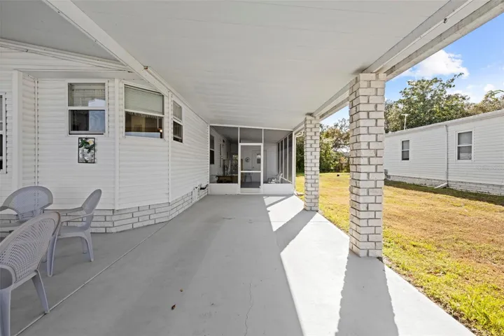 The spacious layout features a living room, a Florida room, a large eat-in kitchen with all appliances, and a separate dining room. The master suite offers mirrored double closets and a master bath with a shower and generous counter space. The home is brightened by cathedral ceilings and benefits from built-in storage throughout. The convenient inside laundry room includes a washer and dryer and leads to a stairway deck landing and a screened porch. Outside, there is a covered carport and a convenient covered shed, ideal for extra storage or a workshop area.