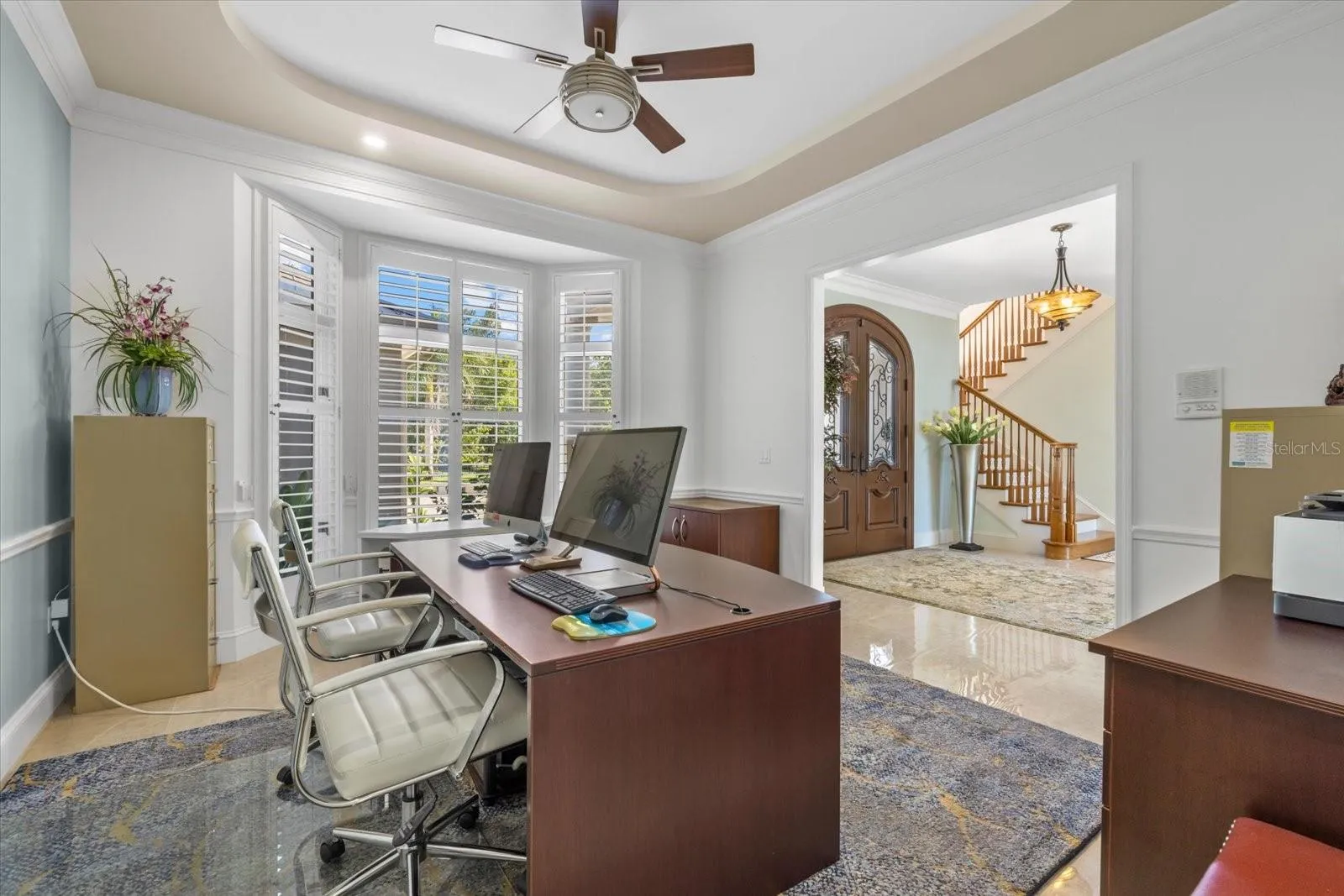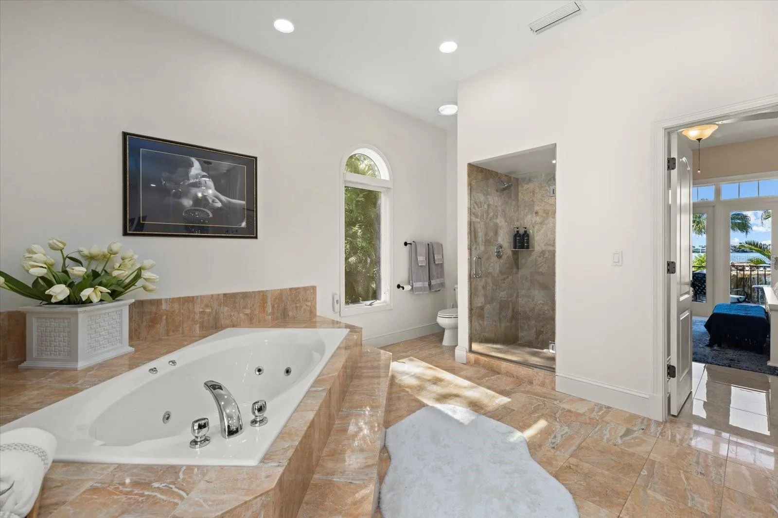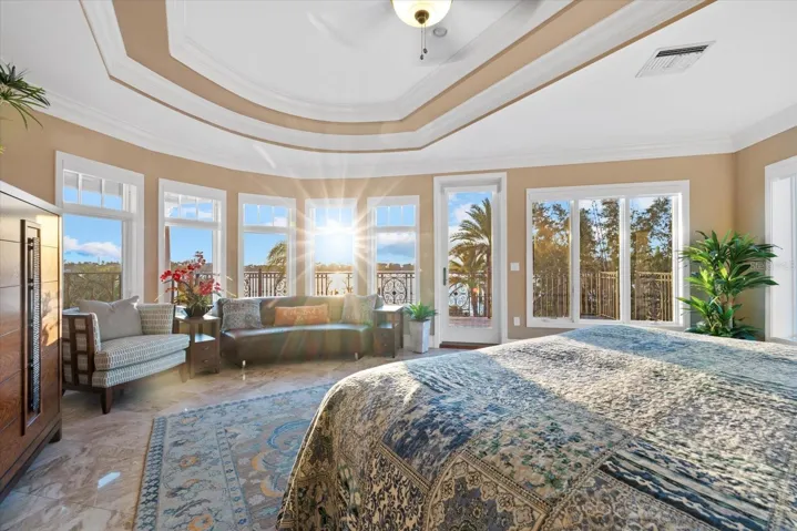 Multiple ensuite bedrooms ensure comfort and privacy. The main-floor guest master offers bay views, patio access, and a spa bath with jacuzzi. Upstairs, two guest suites include private patios, walk-in closets, and upgraded storm doors. The primary suite has a commanding 100-degree bay panorama, private terrace, spa bath with instant-hot water, and extensive custom closets.