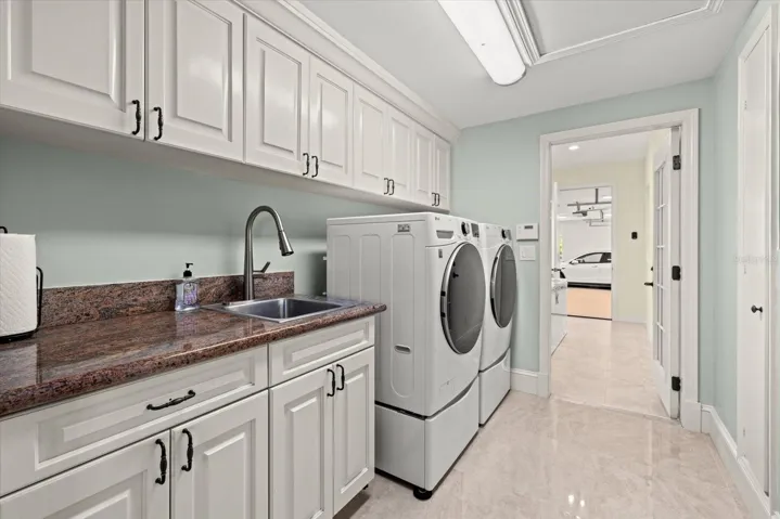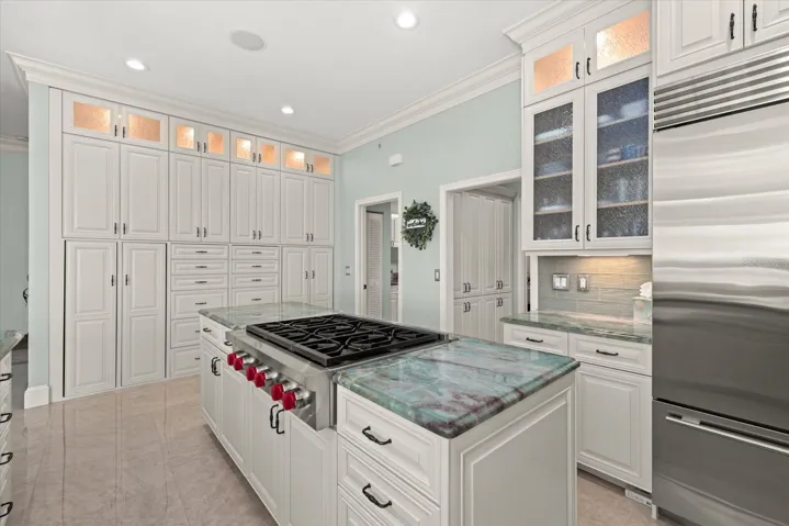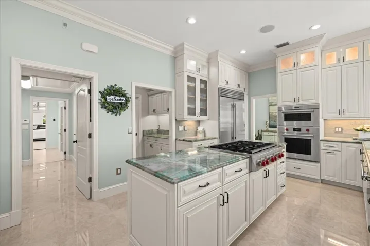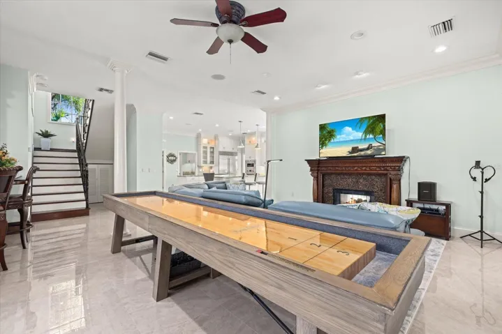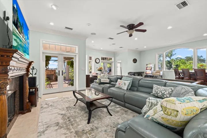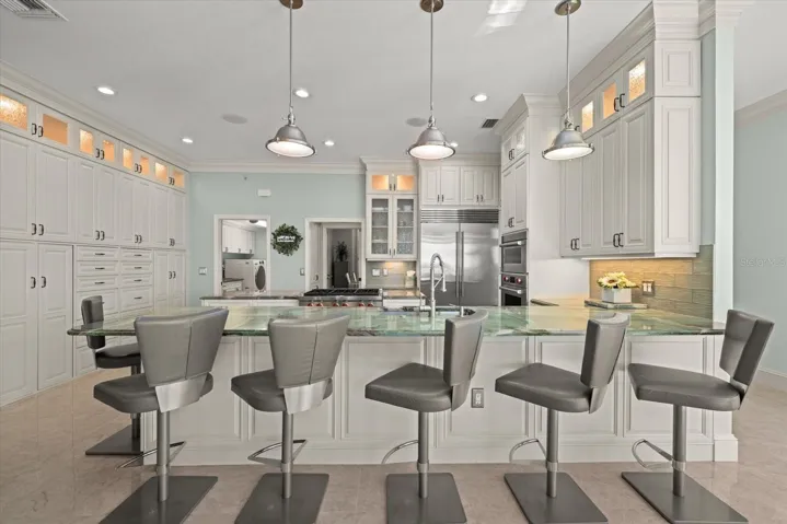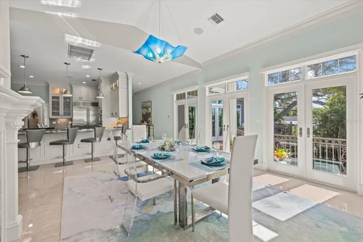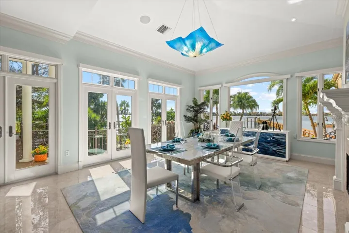 Inside, approximately 6,000 sq.ft. of luxury space showcases new high-gloss 2’x2’ porcelain floors, fresh paint, and panoramic bay views from major living areas and every bedroom. The custom built 2024 chef’s kitchen features a Wolf gas range/ovens, Sub-Zero refrigeration, new Cove dishwasher, 21.7 cu.ft. freezer, rollout coffee system, instant hot water, granite surfaces, and custom cabinetry. The expansive family room with full bar opens to a screened waterfront pavilion with outdoor kitchen, fireplace, and views of the large bayfront pool with waterfall. The dining room includes new lighting and upgraded storm-rated patio doors framing a dramatic 45-degree water vista.