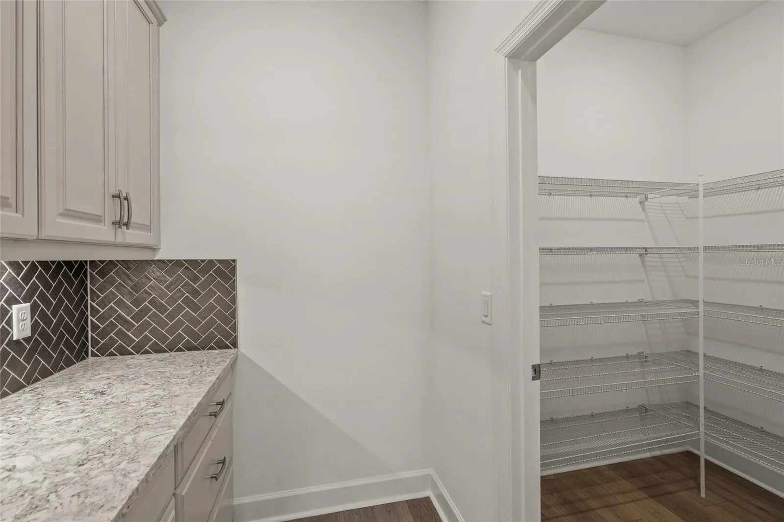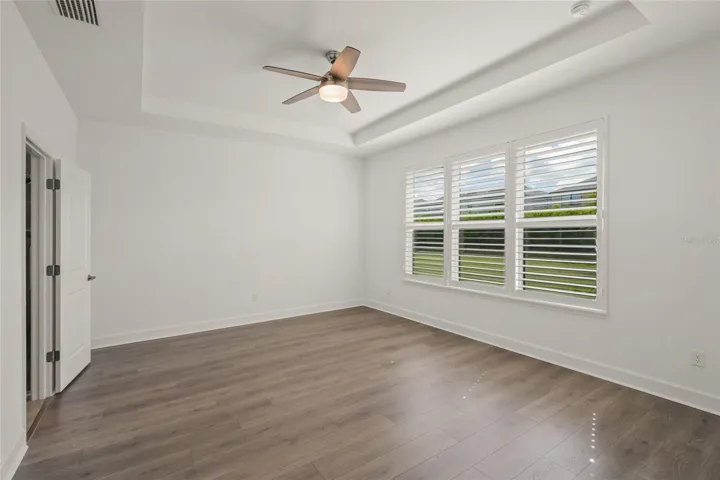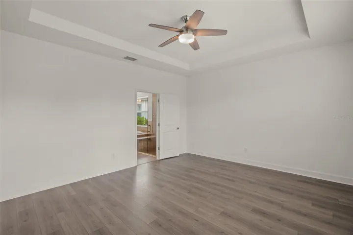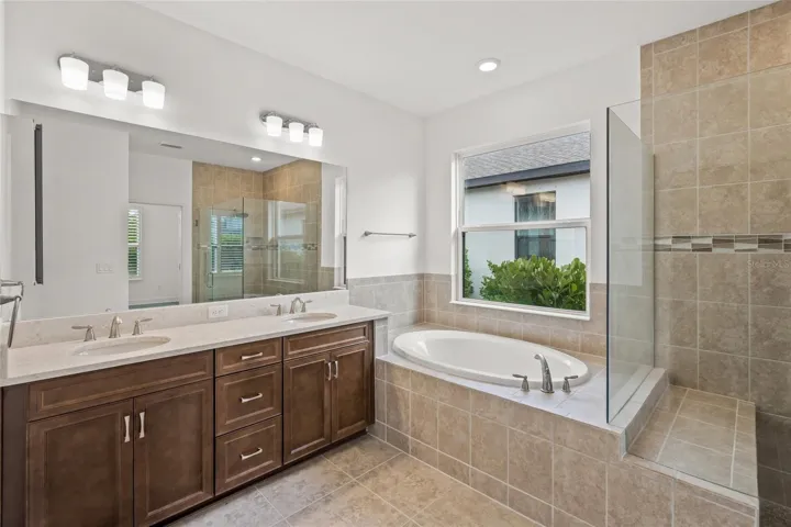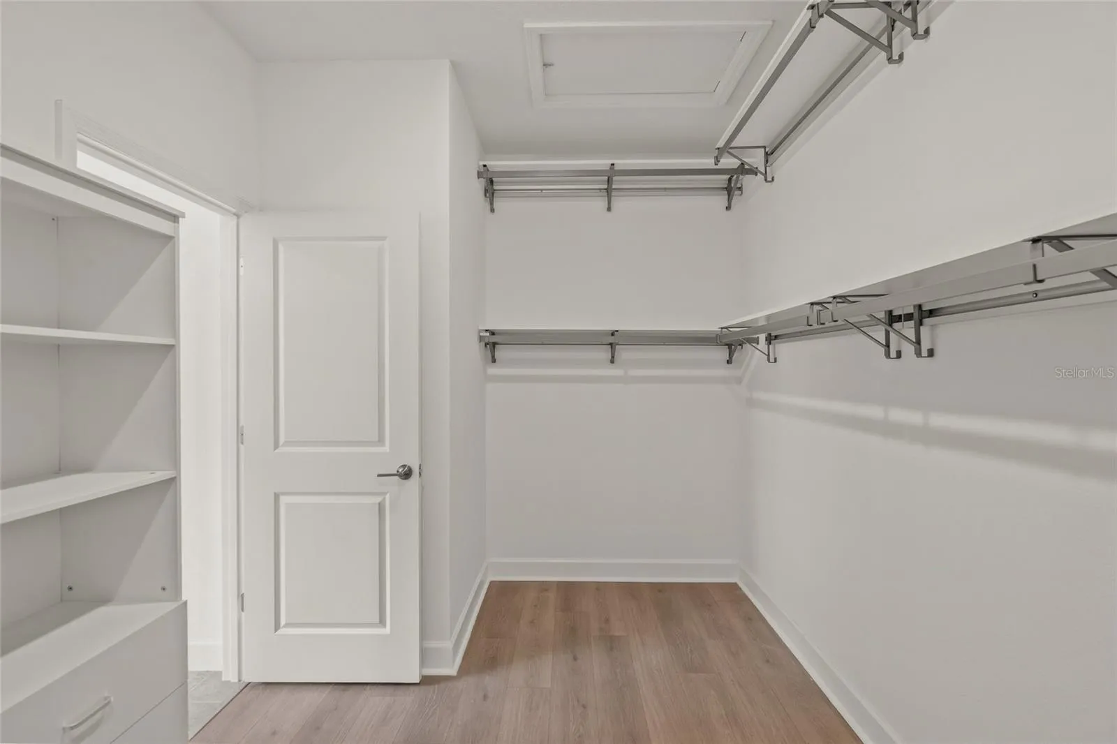 The spacious Owner’s Suite is a private retreat featuring a luxurious en-suite bath with a garden tub, upgraded shower, dual Quartz vanities, and an oversized double-decker closet featuring metal hanging rods and integrated shelving.