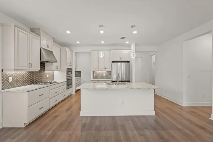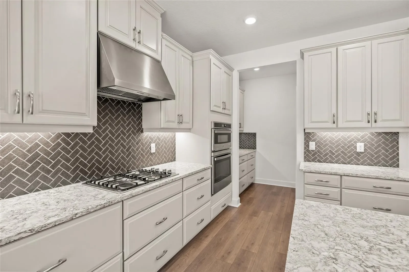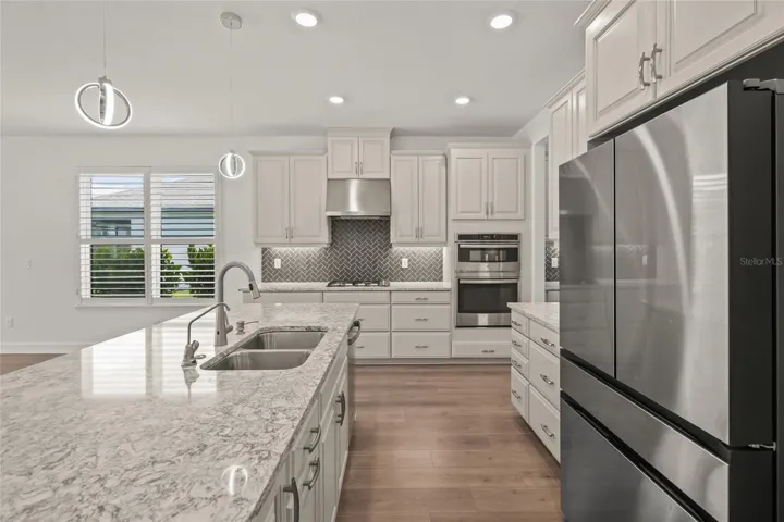 The upgraded gourmet kitchen is a true highlight, boasting beautiful Quartz counters, an abundance of cabinetry and drawers, GE appliances, a sleek Samsung refrigerator, and additional prep and storage space provided by a butler’s pantry and a large walk-in pantry.