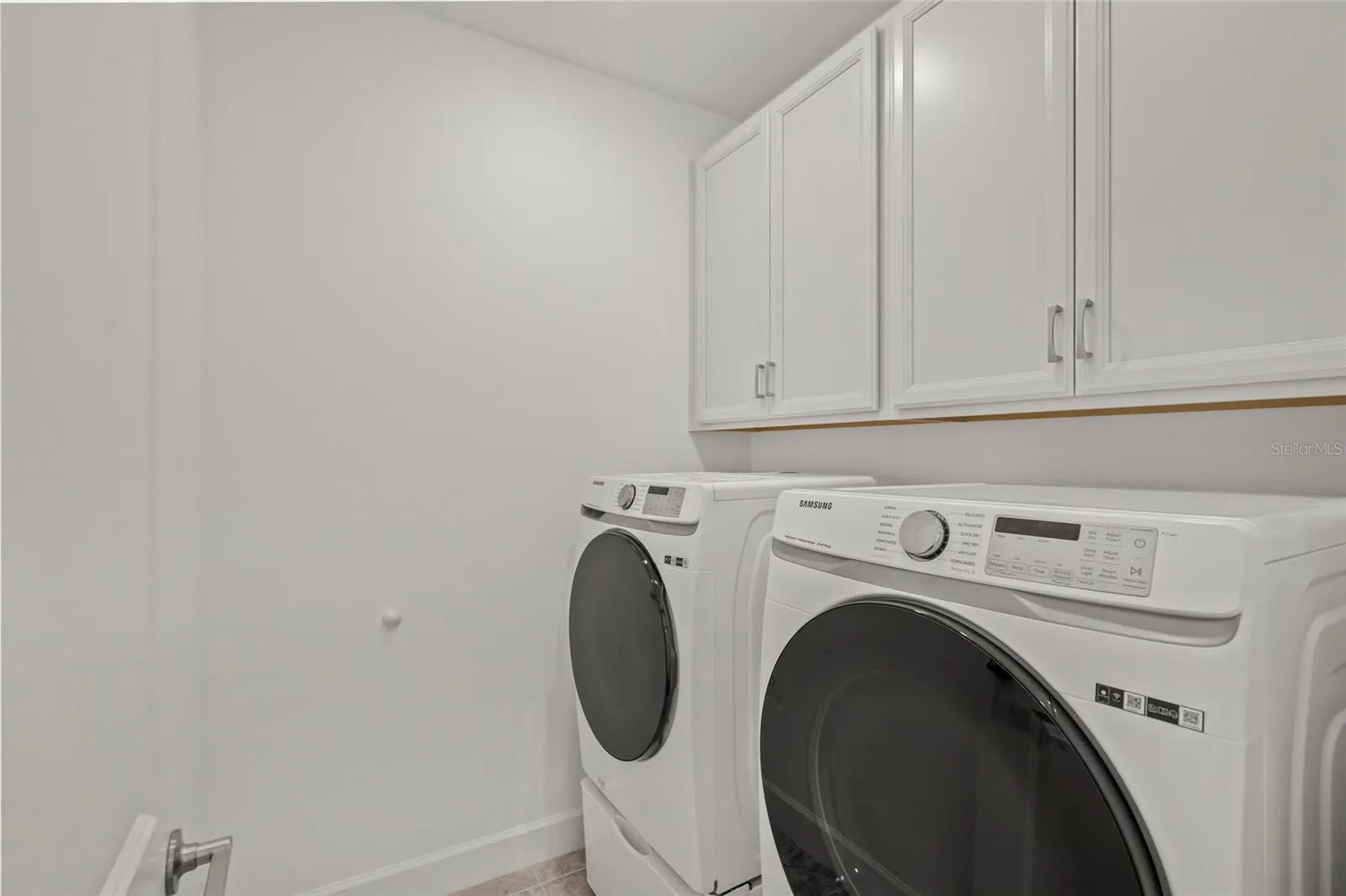 Two additional guest bedrooms share a well-appointed bathroom, also finished with a tub/shower and oversized tile to the ceiling, Quartz countertops, and a separate linen closet. Adjacent to this space is the laundry room, thoughtfully equipped with a washer, dryer, and built-in cabinetry for added convenience and storage.