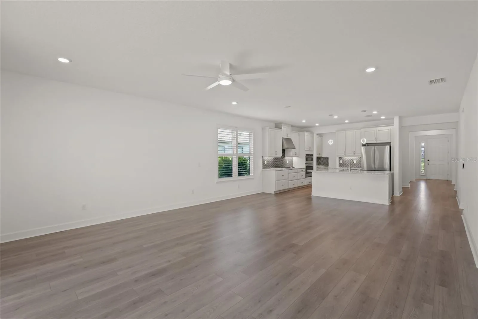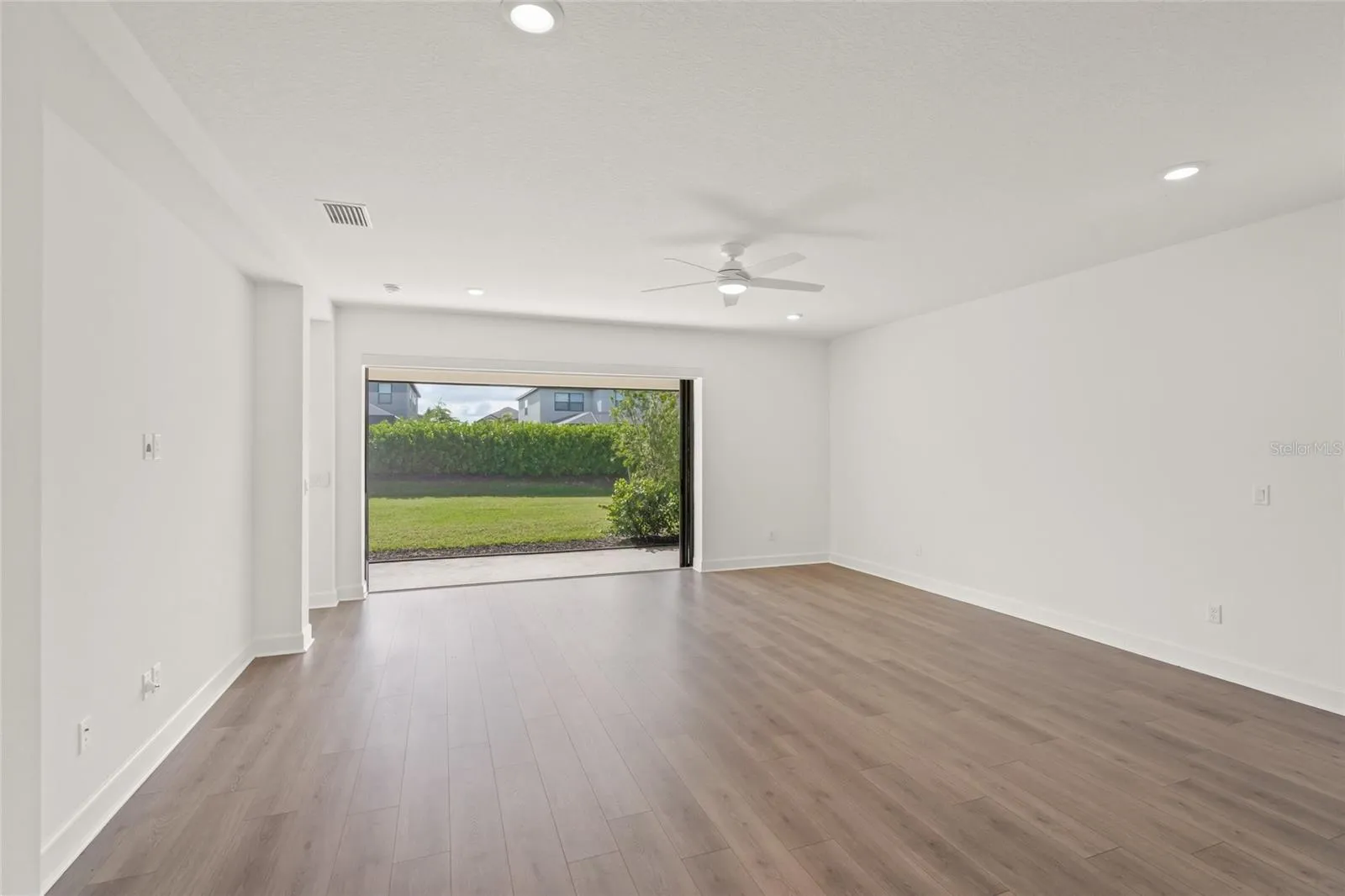The expansive great room and dining area accommodate a variety of furniture configurations, while 11-foot sliding glass doors provide abundant natural light and open fully to create seamless indoor-outdoor living.