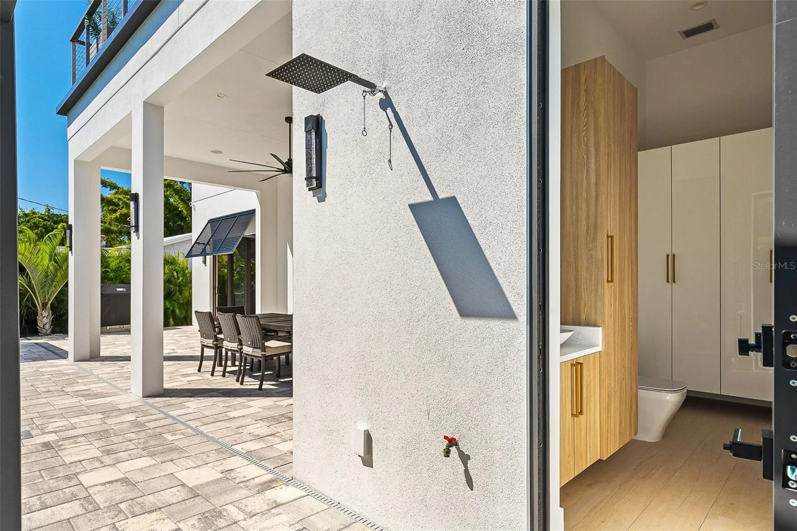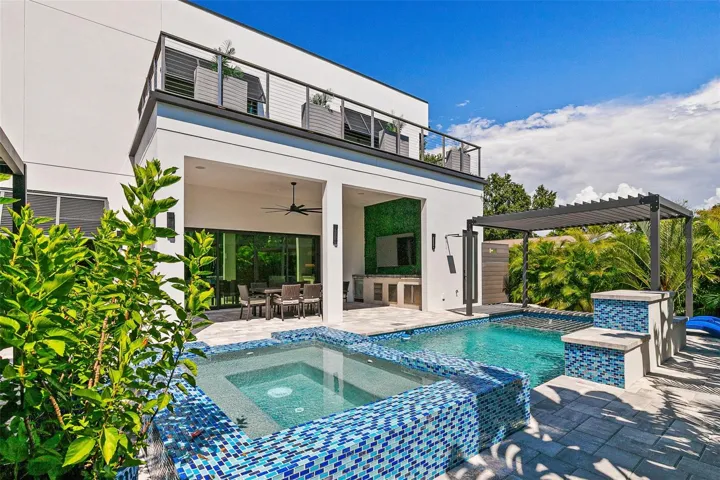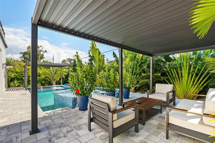 The outdoor living area is equally impressive, boasting a sparkling pool, dedicated pool bath, and outdoor shower. Additional features include impact windows and doors, epoxy-finished two-car garage, exterior lighting, crushed-shell driveway, and a security system.