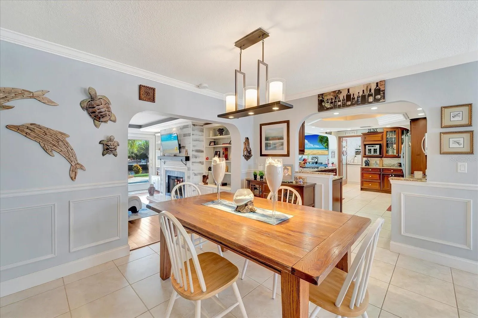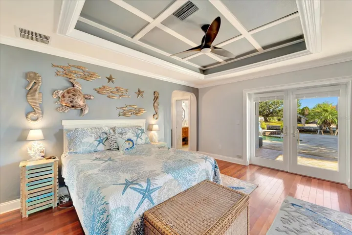 Step inside to find soothing coastal hues, elegant crown molding, and tray ceilings that add a touch of sophistication throughout. The custom kitchen is a chef’s delight, featuring granite countertops, stainless steel appliances, a 5-burner propane cooktop, and a built-in wine refrigerator. Gather with friends in the spacious family room that opens through double sliders to your private pool patio — where a heated saltwater pool, tiki hut, and gazebo create the perfect backdrop for sunsets over Edgewater Lake.