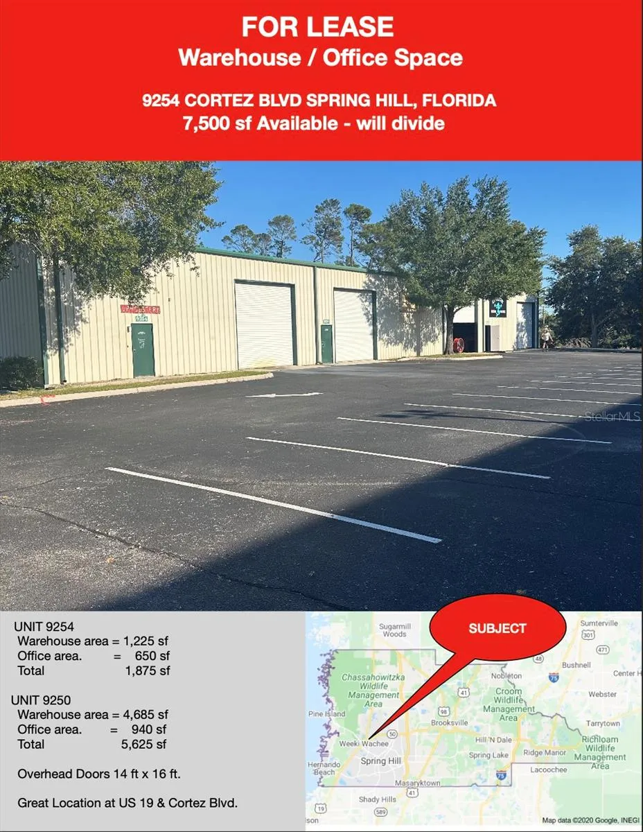 Warehouse space for lease in a great location at US 19 & Cortez Blvd! 22ft high ceilings and 14×22′ high overhead doors. Unit 9254 contains 650 sq ft of office space 1,225 of warehouse space for a total 1,875 sq ft of total space. Unit 9250 contains 940 sq ft of office space and 4,685 sq ft of warehouse space for a total 0f 5,625 sq ft of total space. Well located near the intersection of Cortez Blvd and US 19. Lease space is attractive and in good condition.