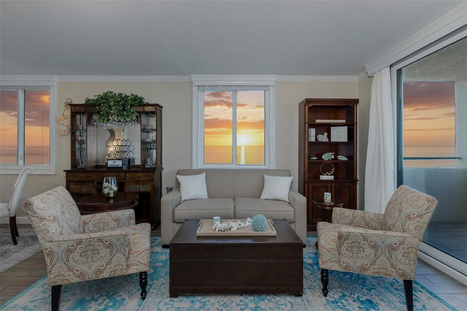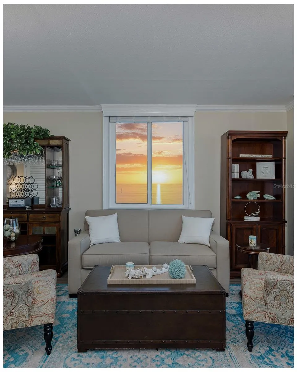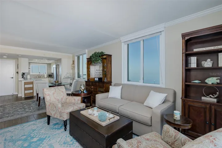 ARE YOU READY TO BE LEFT SPEECHLESS? THIS DECADENT LUXURIOUS CONDOMINIUM WILL DO JUST THAT! Luxurious End-Unit Coastal Retreat with Unrivaled Panoramic Gulf Views in an Exclusive Guard-Gated Community. LOW HOA FEES THAT INCLUDE EVERYTHING. TURN KEY AND FULLY FURNISHED. IMPACT WINDOWS AND EQUIPPED WITH A UNDER BUILDING PARKING SPACE. Experience the pinnacle of waterfront living in this rarely available end-unit condo, perfectly perched on the sought-after 4th floor and offering sweeping, unobstructed Gulf views from nearly every room. One of only six premium corner residences, this light-filled sanctuary invites you to wake up to shimmering waters, vibrant sunsets, and the tranquil presence of dolphins, manatee, and soaring coastal birds. Meticulously appointed and completely turnkey, this sophisticated 2-bedroom, 2-bath residence is designed for effortless luxury. Step inside to discover elegant furnishings, two smart TVs, a full-size washer and dryer, and a beautifully equipped kitchen with stainless steel appliances, a glass-top stove, wine refrigerator, and every thoughtful detail already in place. The versatile second bedroom—featuring a KING SIZED BED , and cozy reading nook—serves perfectly as a guest suite, home office, or creative studio. Peace of mind is built in with HURRICANE IMPACT WINDOWS and sliders, ensuring exceptional protection while enhancing the home’s serene quiet and energy efficiency. The community’s upscale amenities elevate the experience even further: a 24-hour guard gate, refined clubhouse with fitness center and game room, social lounges, pickleball and tennis courts, PICKLEBALL, pristine picnic and beach areas, scenic walking trail, and a sparkling heated saltwater pool. A reserved parking space under building and private storage closet add convenience and exclusivity. The association fee covers water, trash, Spectrum cable TV, and in-unit WiFi—allowing you to simply arrive, unwind, and indulge in the ultimate Florida lifestyle. SCHEDULE YOUR SHOWING TODAY!