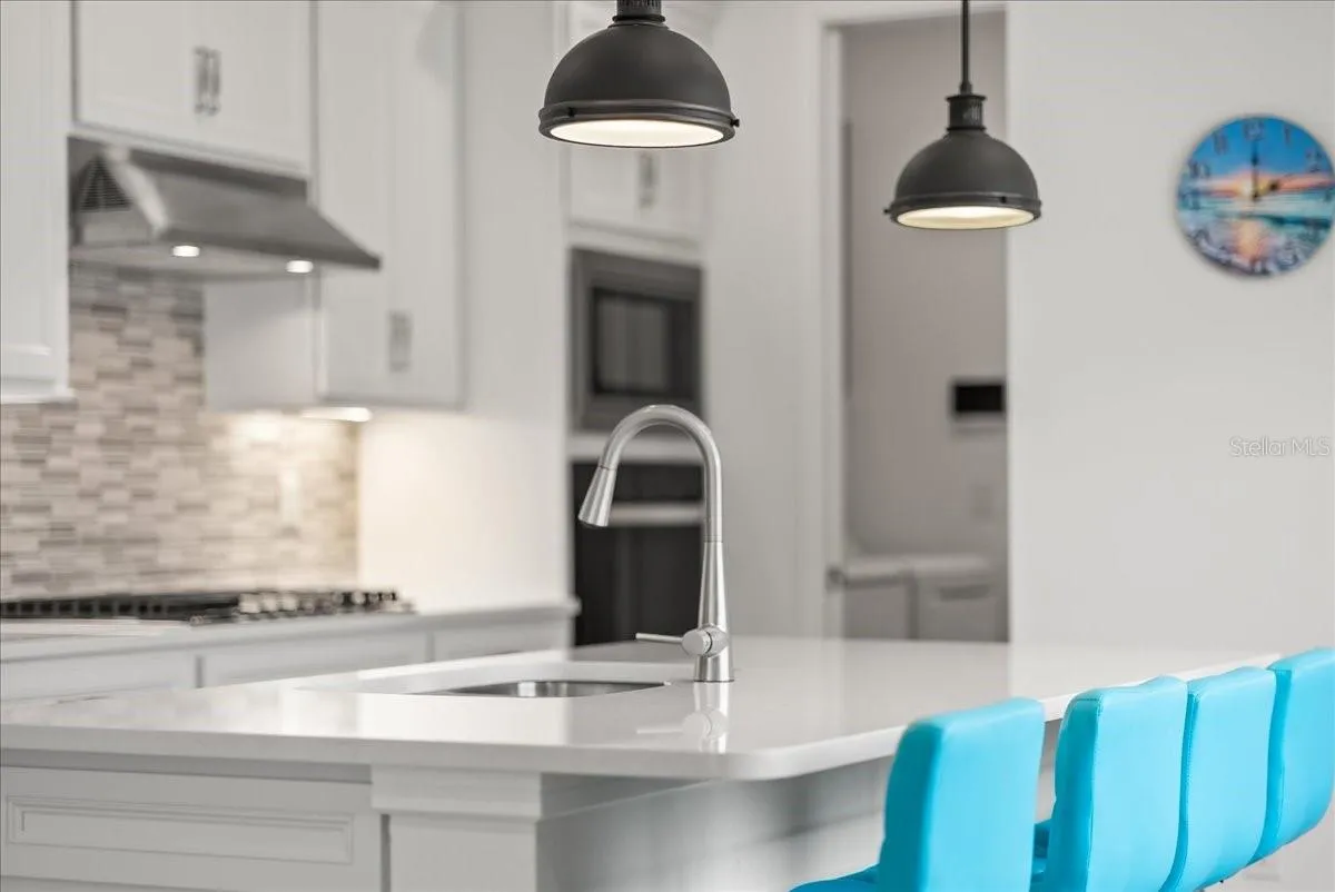 Welcome to lakefront living at its finest in the sought after 55+ resort community of Del Webb at Bayview! Nestled on a serene lakeside lot, this immaculate FULLY FURNISHED home offers an inspired blend of modern comfort, low-maintenance elegance and indoor-outdoor Florida lifestyle. Step into an open floor plan where a sleek, bright white chef’s kitchen anchors the space. The kitchen features crown-molded cabinetry, a stylish tile backsplash, a gas cooktop with stainless range hood, built-in wall oven and microwave and an oversized quartz island with pendant lighting and seating for four. Natural light pours in through large windows and the triple pocket sliding glass doors that lead to the expansive screened lanai, creating the ultimate entertaining flow from inside to outdoors. Imagine morning coffee overlooking the shimmering lake, al-fresco dining, and tranquil evenings as nature winds down around you. Through French doors into a dedicated home office, perfect for remote work or creative pursuits.