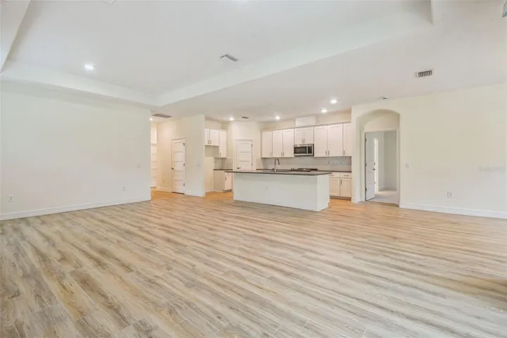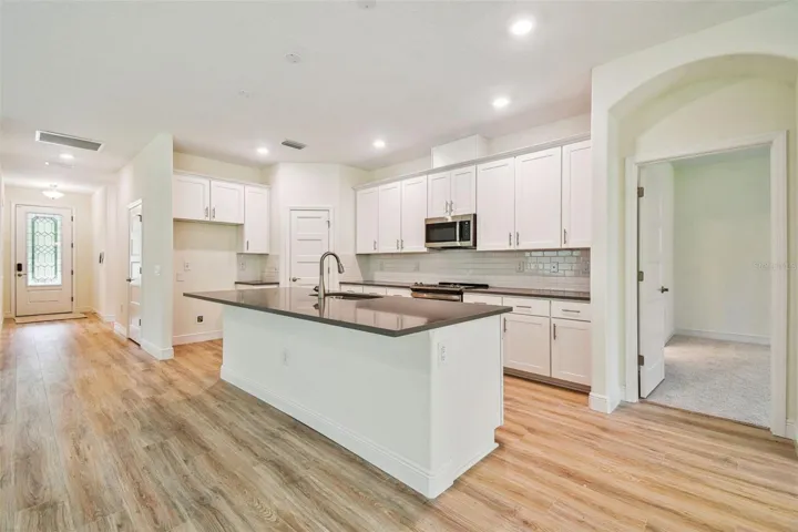 At the heart of the home lies the kitchen featuring 42″ upper cabinets with elegant crown molding, gleaming quartz countertops, a walk-in pantry, and a generous island with bar seating. Premium appliances, including a built-in microwave, range, dishwasher, and disposal, ensure culinary ease while enhancing the kitchen’s sophisticated appeal.