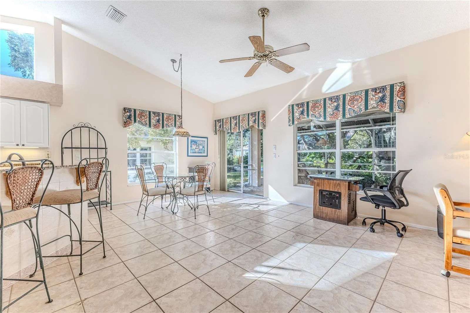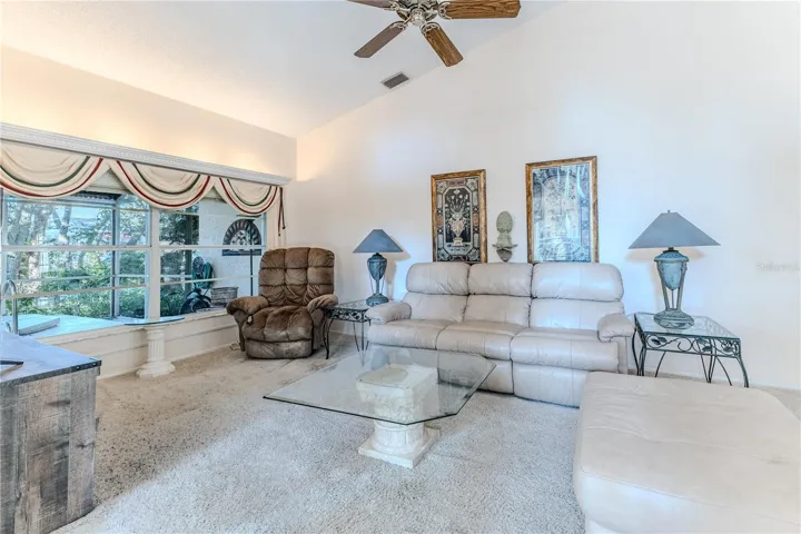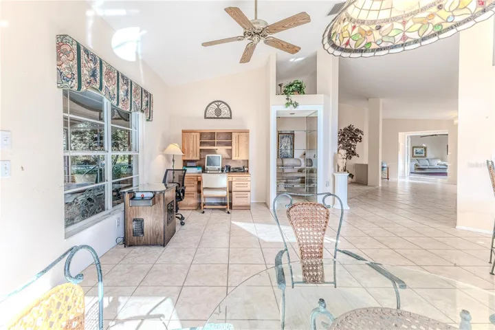 Step into a bright, open layout enhanced by vaulted ceilings in most rooms, creating an airy and spacious feel throughout. The formal living room features serene views of the spa area and includes a ceiling fan for comfort. The formal dining room is perfect for hosting dinners or holiday gatherings.