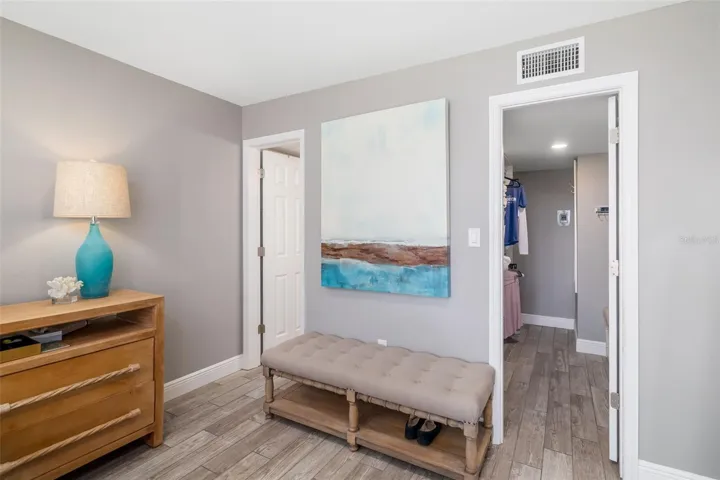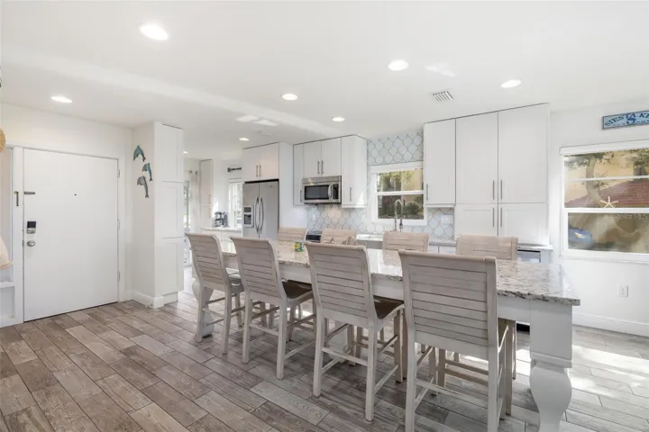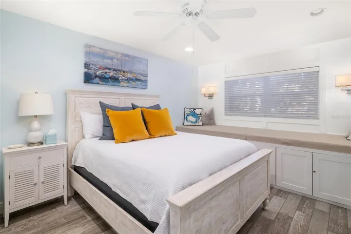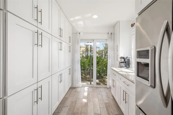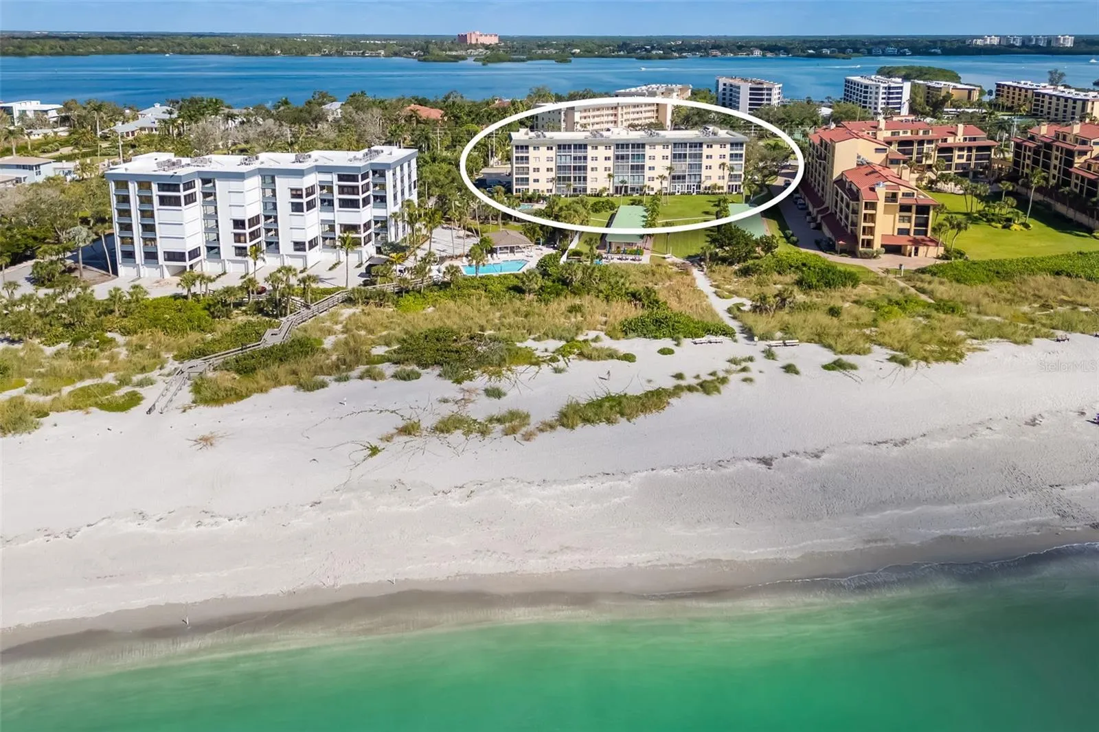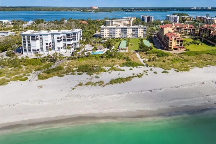 NO FLOODING from hurricanes! Not a drop! This ground floor beach front condo did not get any damage from last year’s storms! Bay Tree Club is an extremely popular community on the south end of Siesta Key and there was no damage to any of the 120 condos in this well managed and maintained community and remains in HIGH DEMAND. This immaculate and easy accessible end unit directly on the gulf is STUNNING with upgrades galore. Sellers have spared no expense expanding their living space and have Installed hurricane impact glass throughout this customized condo. Upon entering, you’ll notice the beautiful solid wood white cabinetry in this spacious kitchen with superior stainless steel appliances including a farmhouse sink. The timeless and classic high polished granite that covers this kitchen is beautiful and was also creatively used to customize a 10 foot built in dining room table. And for added convenience and function, designated work space sits at the front of kitchen next to another point of entry with sliding glass doors, where your designated parking space is located. Primary light filled en-suite bedroom features a French door entry, gorgeous bathroom, and large closet. Behind a big white sliding barn door, you’ll find the guest bath and the secondary bedroom, which has a large and extremely comfortable but still cozy built in bench/sleeping area that features tons of storage beneath giving incredible space and function to this room. Luxury wood plank tile throughout entire condo offers a timeless appeal. Unique to this community are private storage cabanas right off the beach where each owner has their own designated space to keep their e-bikes, beach chairs and other essentials. For added convenience to owners and guests, restrooms are also located directly off your pristine private access to the best location on Turtle Beach. Bring your boat too, as this is a gulf and bay community with superior Trek decking docks. There are BBQ areas and heated pools on both sides of this beach and bay community. The Siesta Key beach trolley stops immediately in front of Bay Tree Club for hop on/hop off free transport to the island’s beaches and to both enormously popular North and South Villages and runs all day up and into the night. This pet friendly community is ideal for a second home or an investment property, permitting one month minimum rentals January through April, and 2 weeks the remaining 8 months of the year. Make no mistake- this corner unit on the gulf side can boast a high-end renovation with premium finishes and is in an exceptional location. The unit has a rental in place for February 2026, that must be honored.
