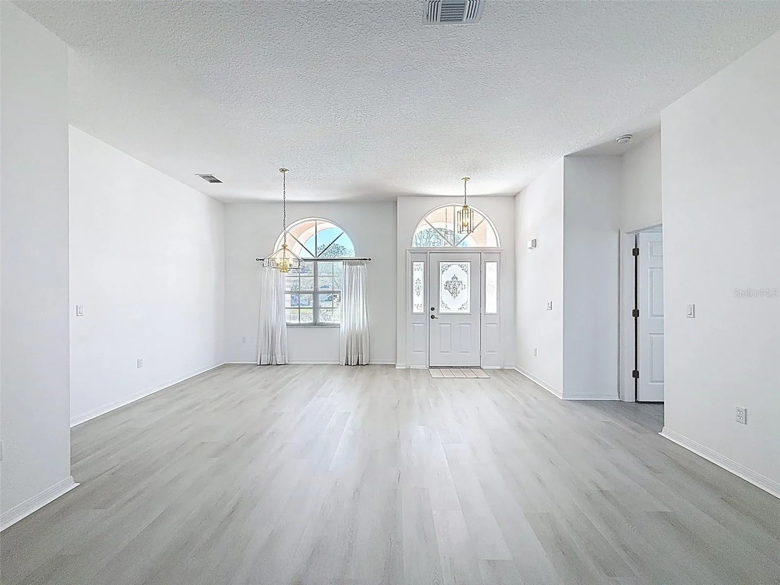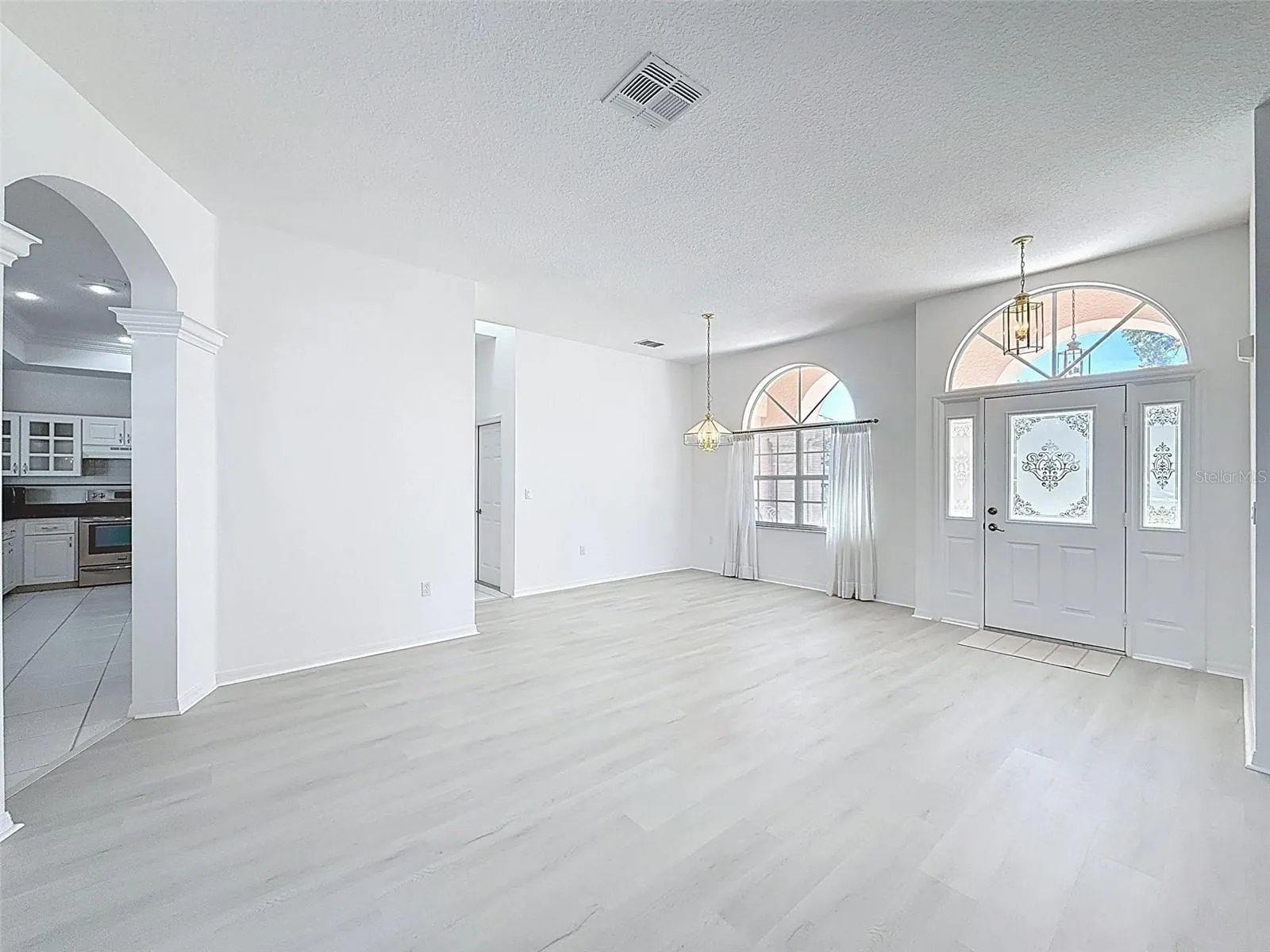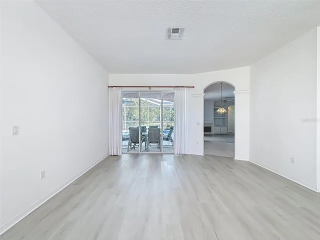 Step through the front door into a bright, welcoming family and dining room combination, filled with natural light from the wide 3-panel sliders that frame beautiful views of the sparkling pool.