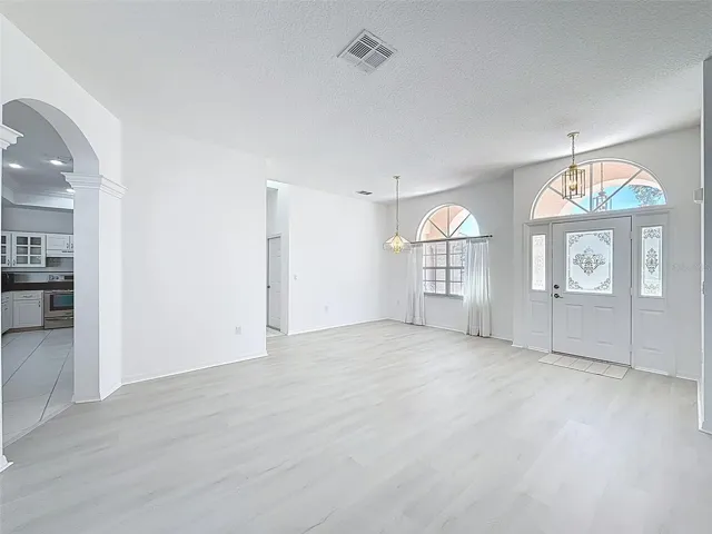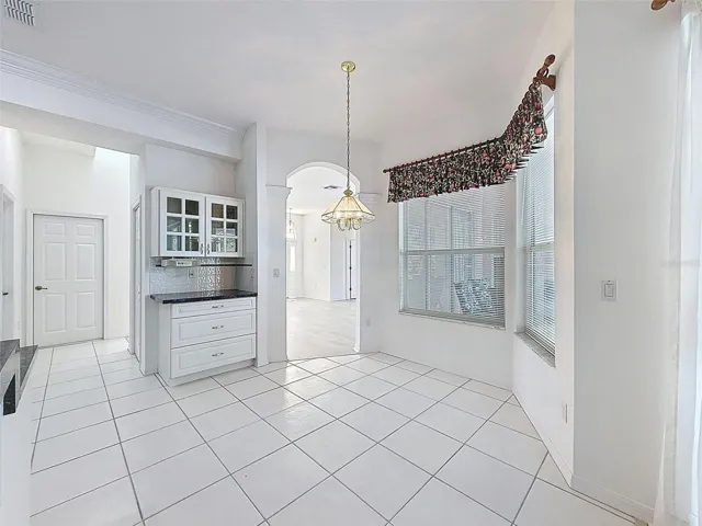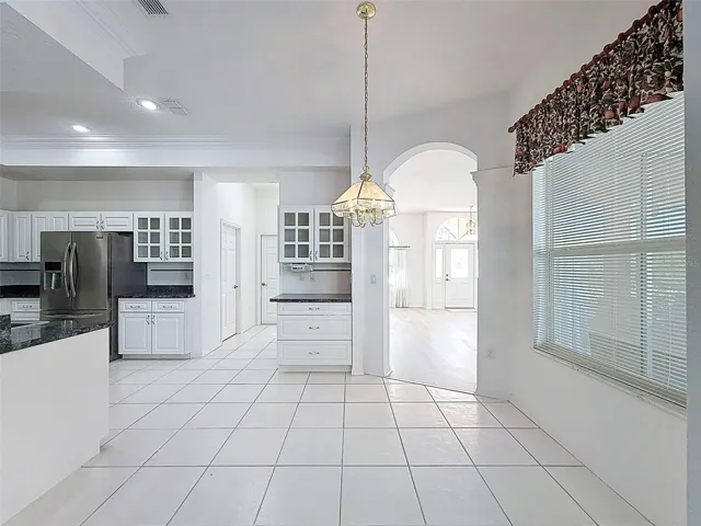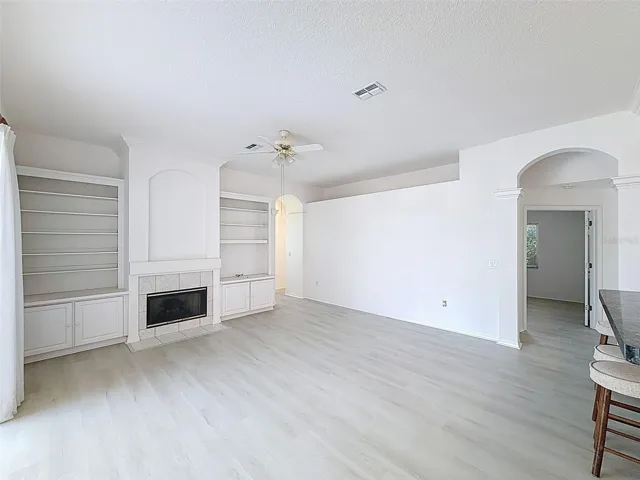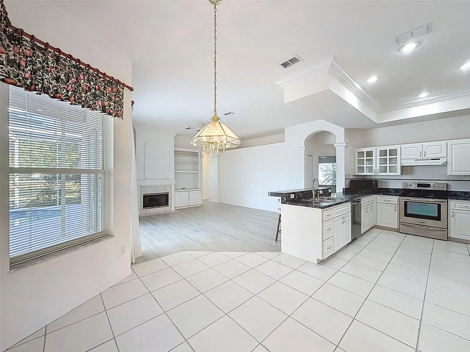 Through the family room, an elegant arched entry leads into the sunny breakfast nook and well-appointed kitchen, featuring stainless steel appliances, stunning white showcase cabinetry, extensive built-in storage, a high bar for additional seating, and abundant counter space ideal for cooking and entertaining. The kitchen flows seamlessly into the inviting living room, complete with a cozy wood burning fireplace and beautiful new luxury vinyl floors.