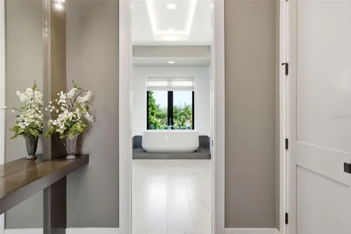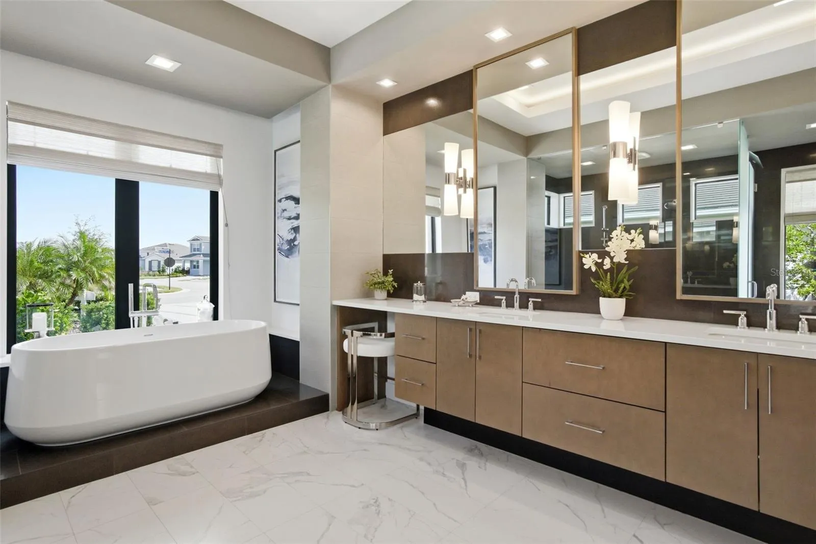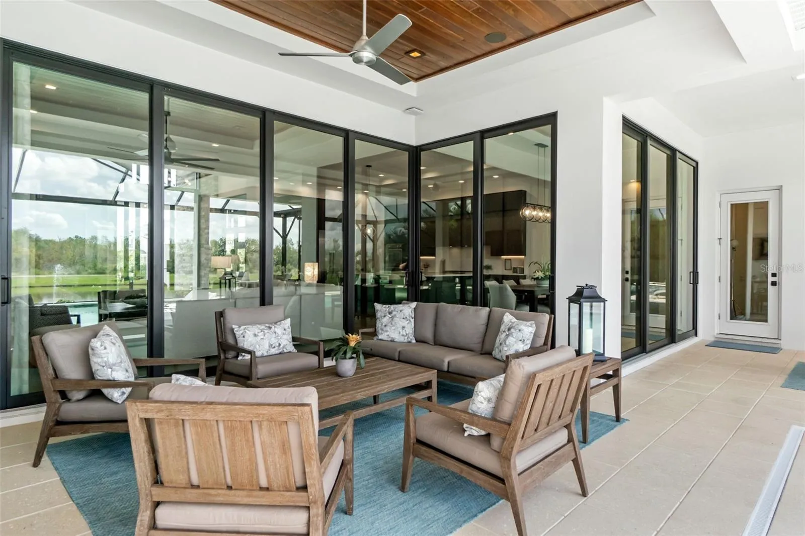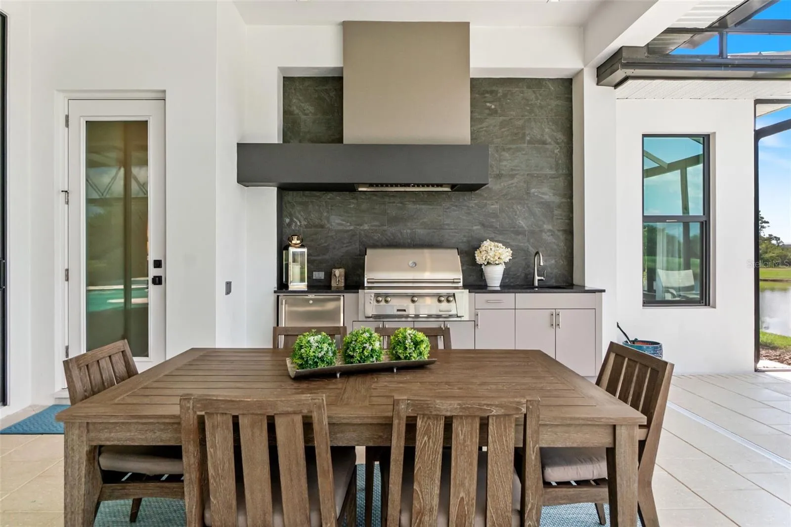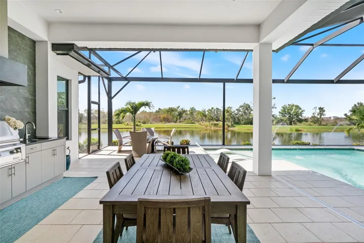 Enjoy Florida’s indoor-outdoor lifestyle with a corner pocket slider opening to the expansive lanai, complete with an outdoor kitchen, Ultraview screen enclosure, and a hot tub that cascades into the pool, all set against a private preserve backdrop.