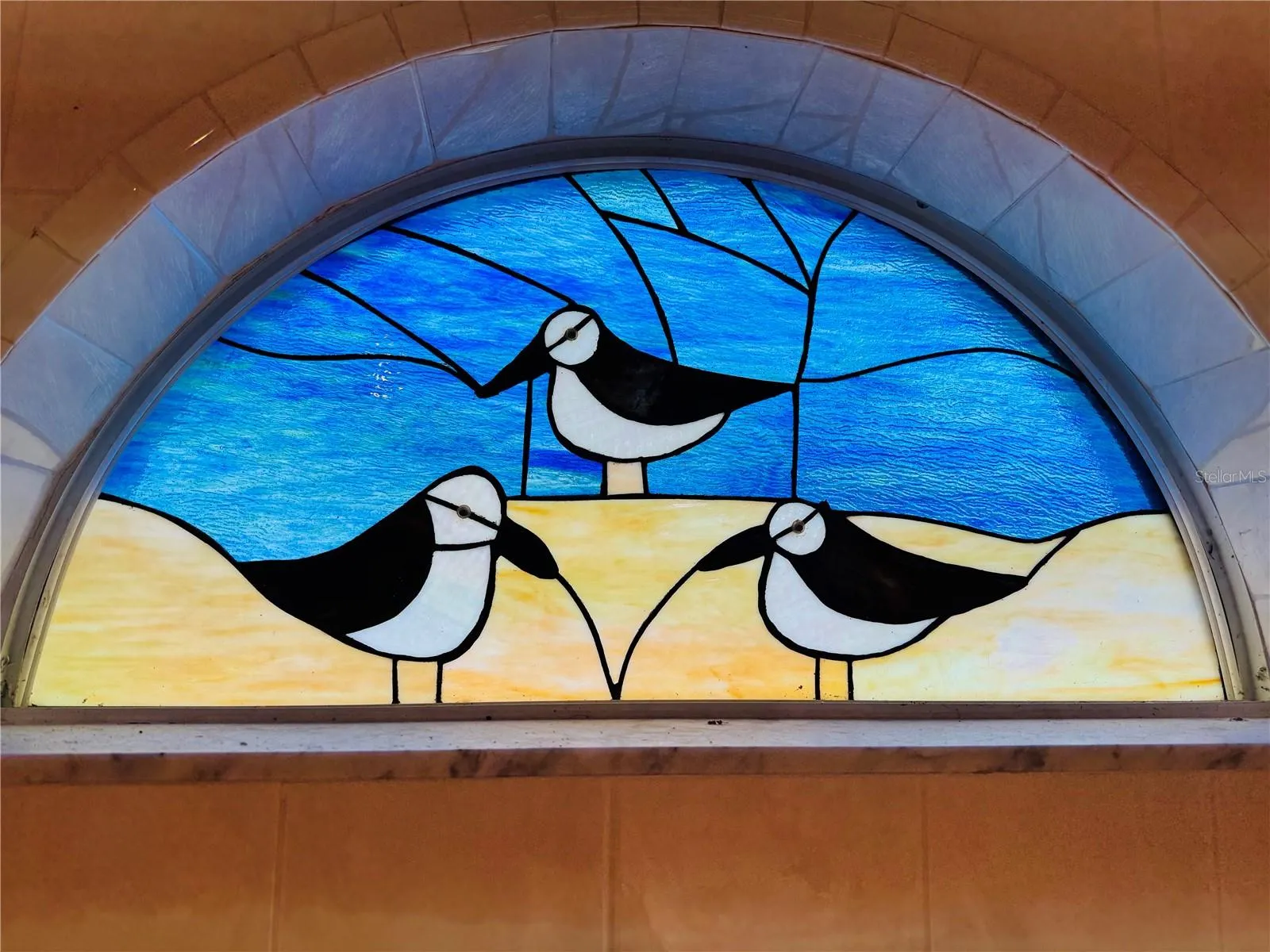The interior is characterized by standout features such as an 18-foot beamed ceiling, a fieldstone accent wall featuring an electric fireplace and engineered hardwood flooring.