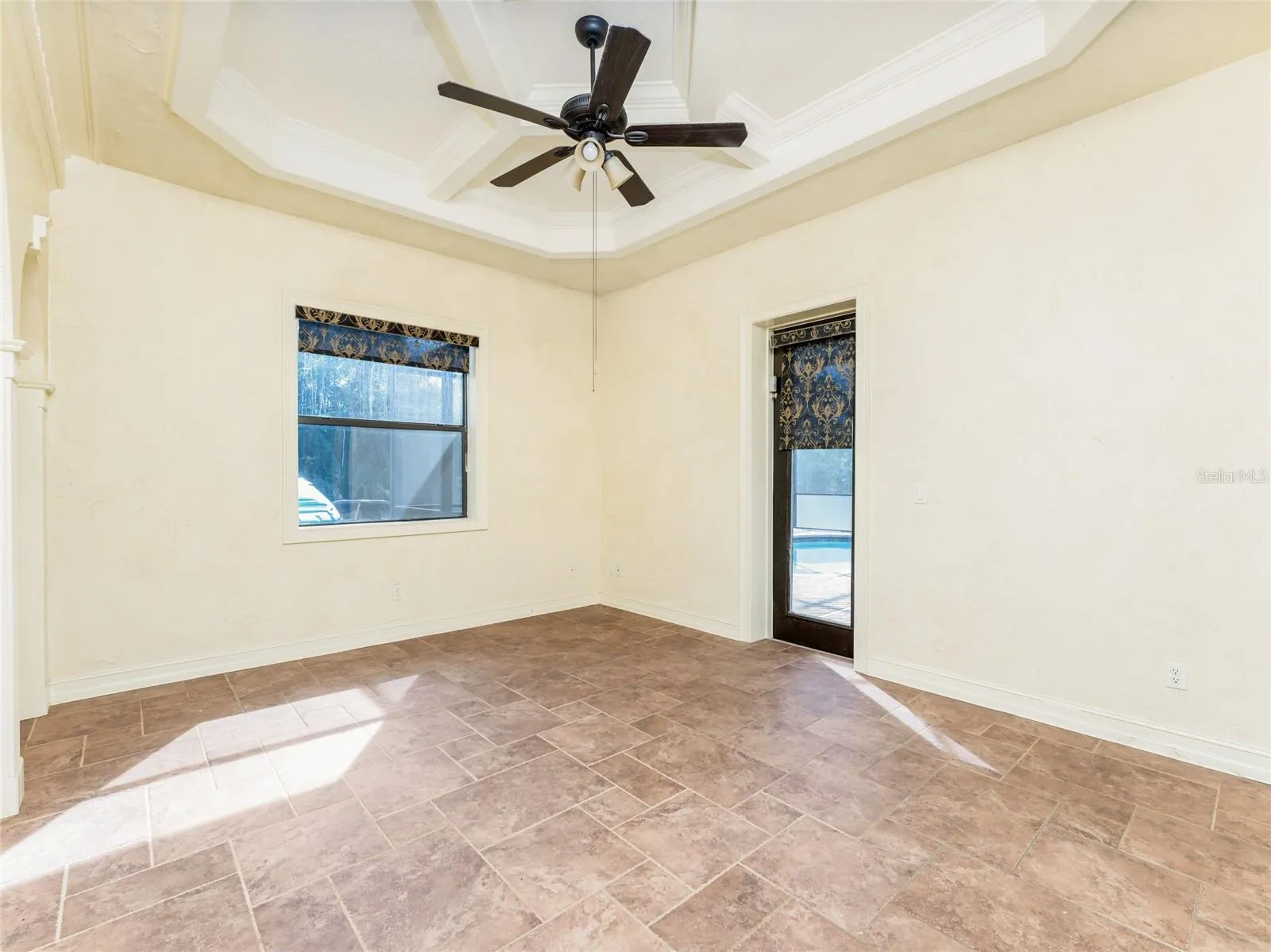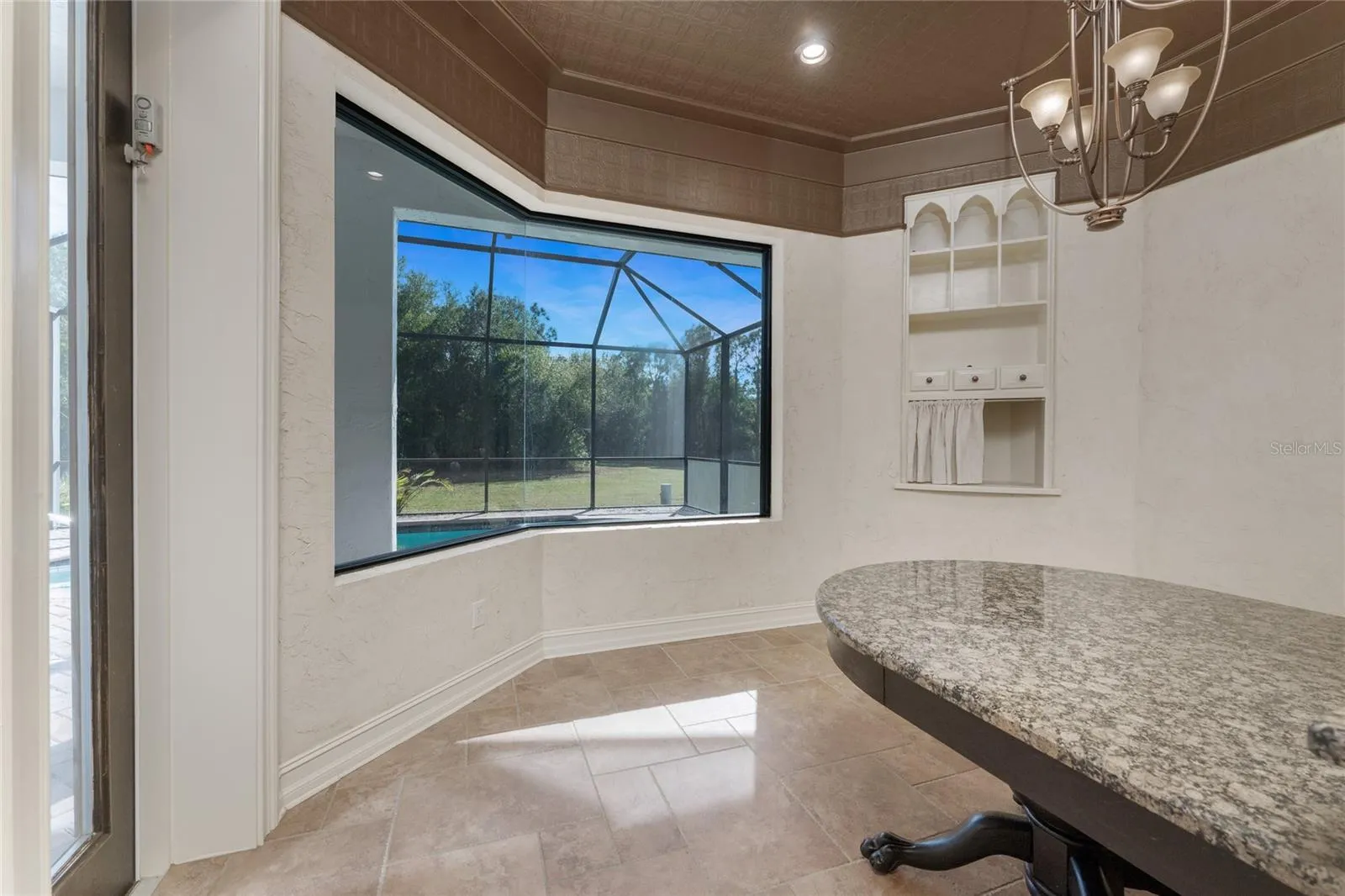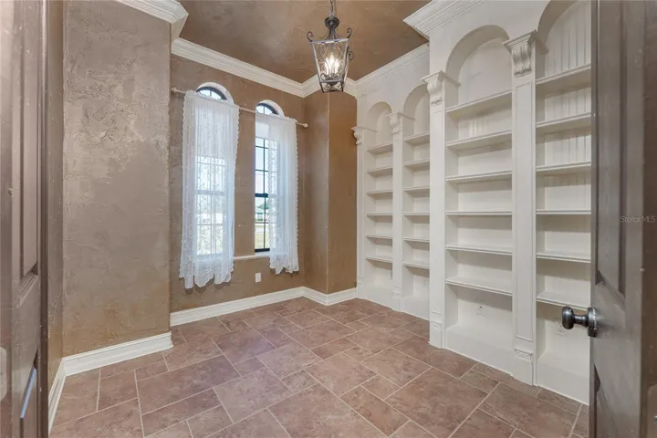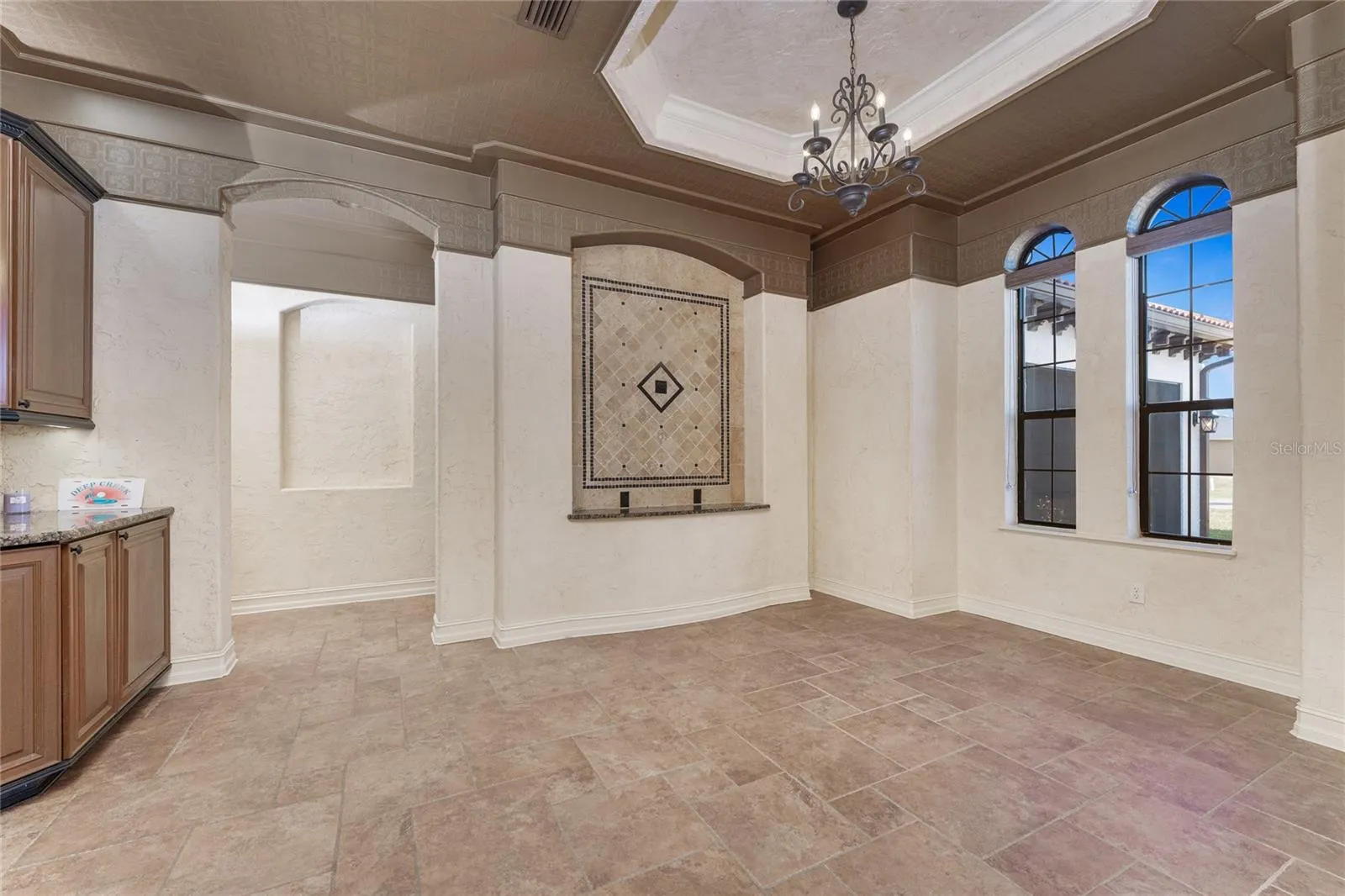 Every corner of this home reflects Tuscan-inspired craftsmanship, from tray ceilings, copper-toned ceilings featuring a coffer-inspired pattern, built-in niches, and custom shelving to elegant crown molding throughout. The gourmet galley kitchen is a chef’s dream, boasting granite countertops, solid wood cabinetry, a double pantry, brass canned lighting fixtures and an eat-in area with aquarium-style glass overlooking the pool and greenscape. The formal dining room impresses with a stone-tiled arched niche, tray ceiling, and copper-toned crown molding, making it perfect for entertaining family and friends.