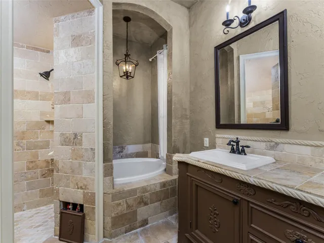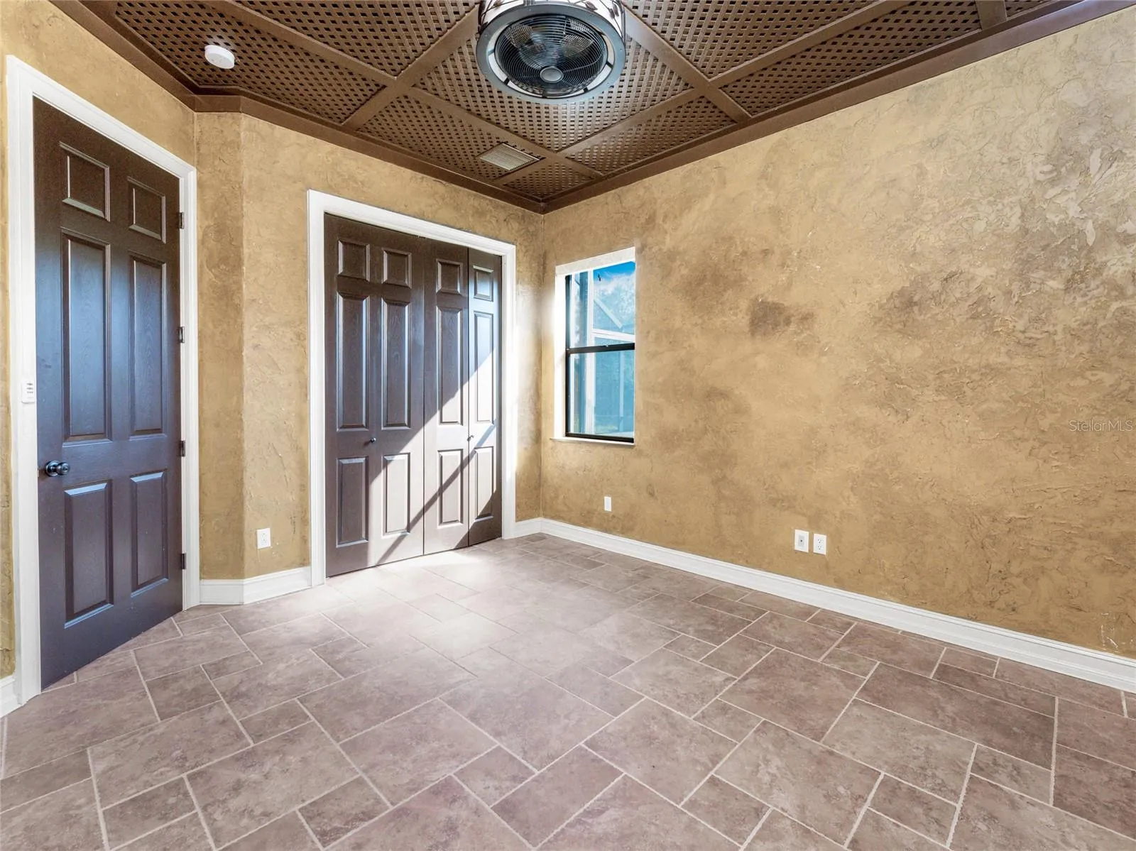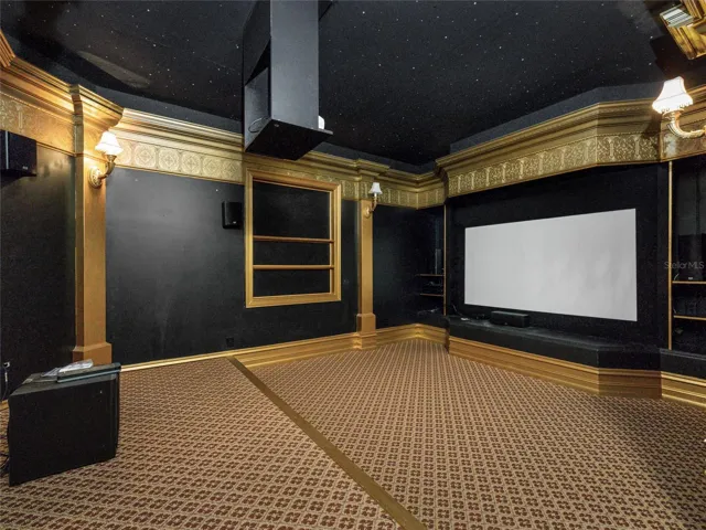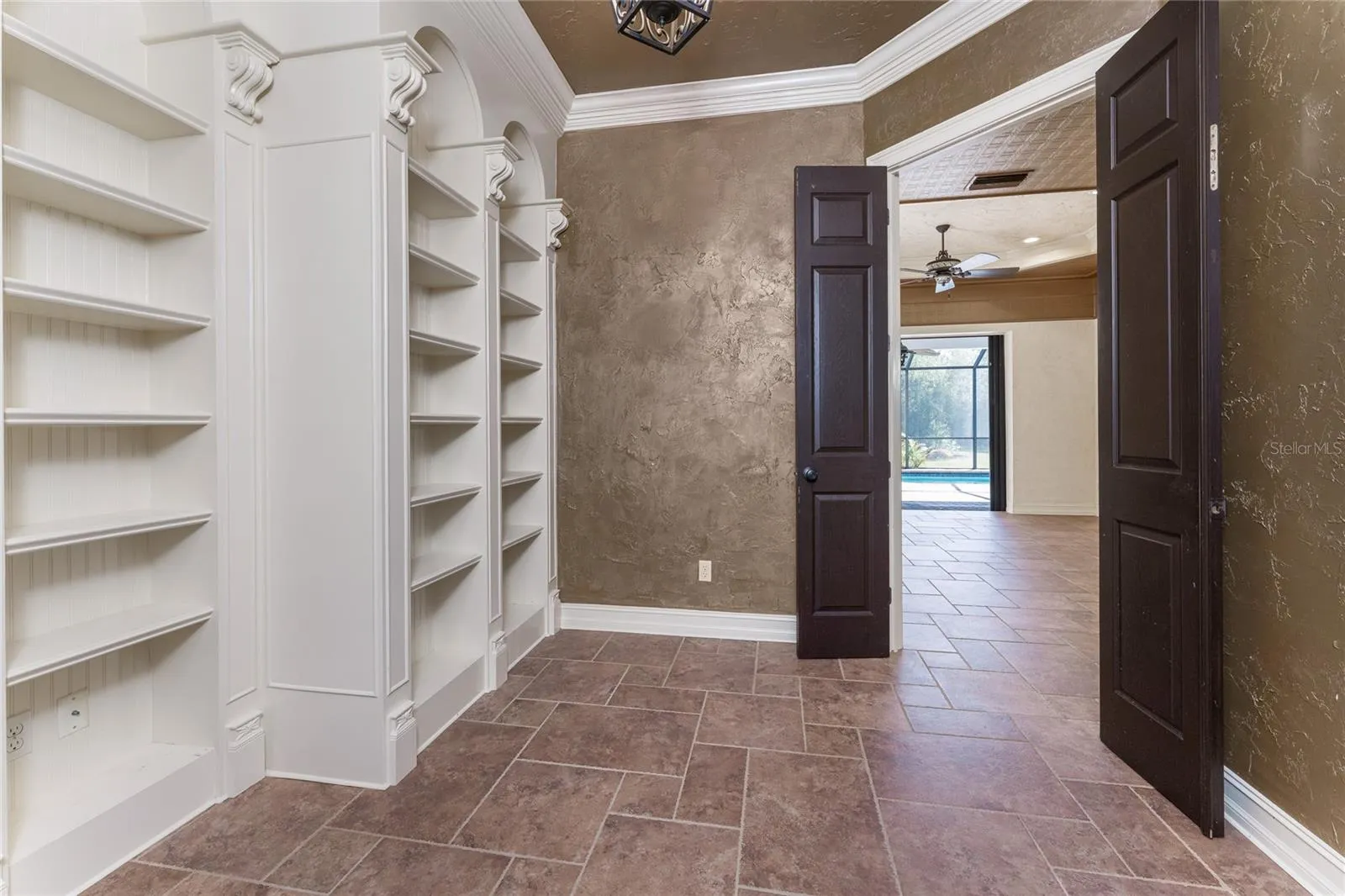 The primary suite is a private retreat with a Tuscan-style triple-arched niche, tray ceiling, walk-in closet, dual vanity, private toilet, Roman garden tub, and walk-in shower. Two additional guest bedrooms and split-floorplan provide privacy and flexibility. One bedroom currently serves as a soundproofed home theater with blacked-out walls, twinkle ceiling lights, surround sound, and Epson LCD projector and receiver, ideal for movie nights or easily converted to a traditional bedroom. A den/study off the main living area features floor to ceiling custom built-in shelving, providing additional flexible space for work, hobbies, or guests.