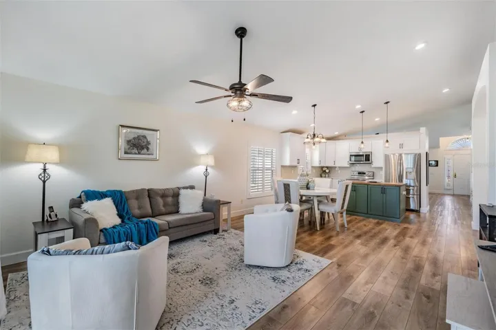 Fully remodeled and updated and looks like it should be in a magazine with 3 bedrooms PLUS an office/flex space. ROOF 2021; NEW WINDOWS 2025; A/C SYSTEM 2025. Enjoy sweeping golf course views from the inviting Florida room in this beautifully maintained home. The updated kitchen is a true standout, featuring a custom island with abundant storage, stone countertops, generous cabinetry, stainless steel appliances, and an eat-in area that flows seamlessly into the family room—both offering serene views of the fairway. Throughout the home, plantation shutters, a neutral color palette, and luxury vinyl plank flooring in the main living areas create a cohesive and timeless feel. The primary suite is thoughtfully designed with a versatile office/flex nook ideal for a home office. The spa-inspired primary bath includes stone countertops, a separate step-in shower with built-in bench, private water closet, and a corner garden tub for the ultimate retreat. Secondary bedrooms are comfortably sized, and the guest bath fully updated. A spacious walk-in laundry room with built-in storage and a utility sink adds everyday convenience. Finally, the sun-filled Florida room—showcasing panoramic golf course vistas—offers the perfect spot to begin or end your day in total relaxation. 55 & FUN – LIVE THE HERITAGE SPRINGS LIFESTYLE – Resort style living at its absolute finest! Clubhouse with restaurant and bar, fitness, tennis, golf, cards, billiards, dancing and more! SUPERB TRINITY LOCATION, CLOSE TO BEACHES, DINING, SHOPPING, MEDICAL AND AIRPORT! Caution – Adults at Play!