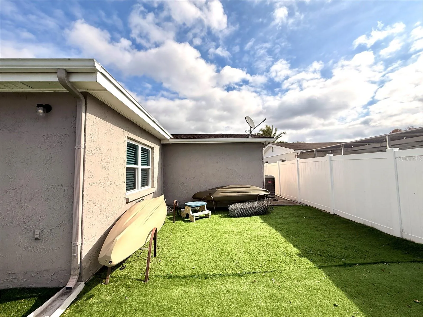 Just beyond the porch is a covered patio area, perfect for grilling, hanging out, and hosting gatherings. This overlooks your fully fenced turf backyard, offering low-maintenance living and plenty of space to store your toys.