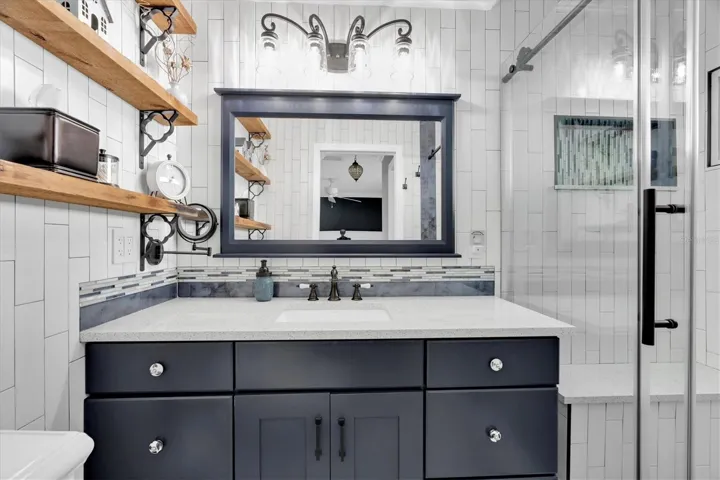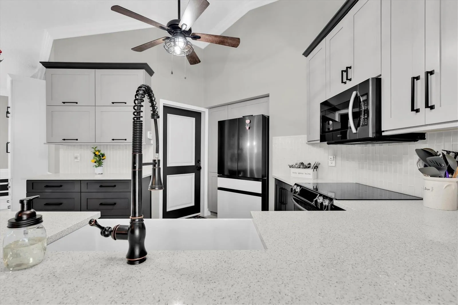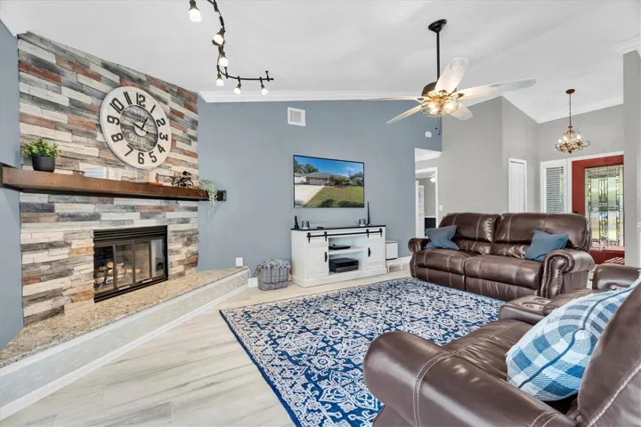 Inside, the fully remodeled kitchen shines with custom all-wood cabinetry, quartz countertops, a farmhouse sink, and generous workspace—perfect for family meals and entertaining. There is 4″x8″ inch porcelain plank tile, elegant crown molding, and vaulted ceilings that flow throughout the home. The inviting living area is centered around a custom wood-burning fireplace with a beautiful stone surround and stainless steel chimney insert, creating a warm and cozy gathering space.