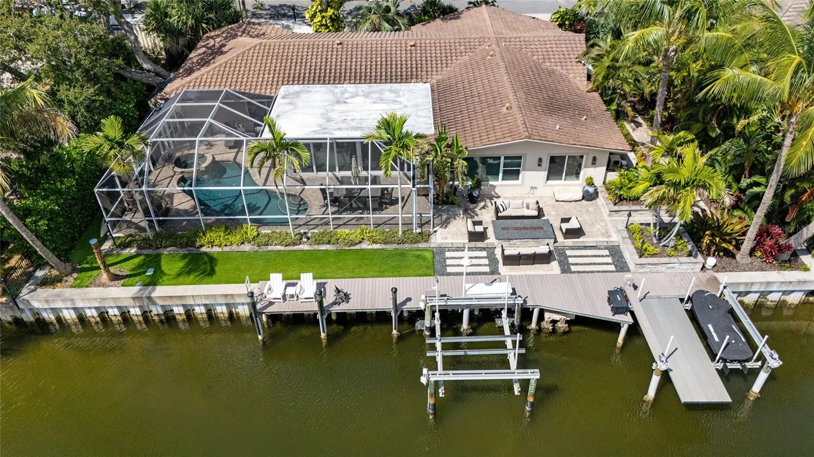 ELEGANT SIESTA KEY WATERFRONT RETREAT – Welcome to a truly distinguished canal-front residence, where timeless design meets the effortless beauty of waterfront living. Set beneath majestic oaks and tropical landscaping, the canopied circular paver driveway greets you. This exquisite pool home offers privacy, sophistication and an extraordinary outdoor lifestyle. An avid boater’s dream with 110 feet of water frontage, a 16K LB. boat lift and a double jet-ski lift. Light and bright, neutral colors and tile flooring flow throughout the home. The main living areas include a large great room surrounded by windows and flooded with natural light which frame peaceful tropical water views and the outdoor living area. Separate living room, den or game room and formal dining room offer an open layout and flexible floorplan which allows you to personalize your living space for your lifestyle. Fabulous cook’s kitchen is open to great room and nicely updated with solid wood cabinetry, stone countertops and backsplash, stainless appliances with gas range, large wine cooler and pantry. Custom butler’s pantry added for convenience and large laundry room with storage cabinets galore. The owner’s retreat is spacious and serene, offering tropical views of the pool and waterfront along with private lanai access. It features a generous walk-in closet and a beautifully updated bath with sleek stone countertops, dual sinks and a tranquil walk-in shower illuminated by soft, filtered light through the glass block windows. Two private guest en suites are thoughtfully positioned in separate wings, each offering its own beautifully updated bath. Relax and sip a cool drink on your sunny lanai and observe manatees or fish right off your own dock. Watch fish at night with new underwater snook light. Enjoy gorgeous pool area with wide intersecting canal views and remote controlled fire pit and tiki torches, wonderful for entertaining friends and family. Coastal living at its best! A quick 7-minute access to the intercoastal waterway and Roberts Bay. Just a short bike ride to world-famous Siesta Key Beach and The Village. Enjoy swimming, boating, fishing, kayaking, fine dining and all the comforts of living in paradise. Newer top of the line sea wall with cap and 5×50 foot dock complete with water and electric. Appreciate the safety and security that a Generac whole house generator and hurricane windows, doors and garage door offer. Too many upgrades to list including: Custom interior window shutters, newer breaker box panel, well system for irrigation, new pool heater and pool pumps, outdoor fridge, ice maker, storage shed, 2 under the counter ice makers, no grass (maintenance free) landscape, utility sink and cabinetry in garage. The perfect property for year-round living, a second home or investment as an Island getaway. Truly a unique home that lives well with a great vibe! Nestled on a private cul-de-sac street experiencing significant luxury redevelopment! A rare opportunity and great value for the most discriminating buyer seeking the ultimate Florida lifestyle.