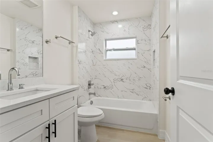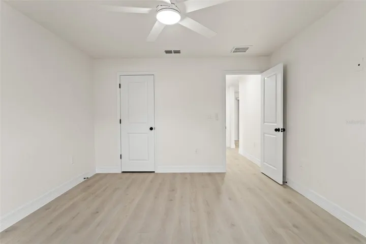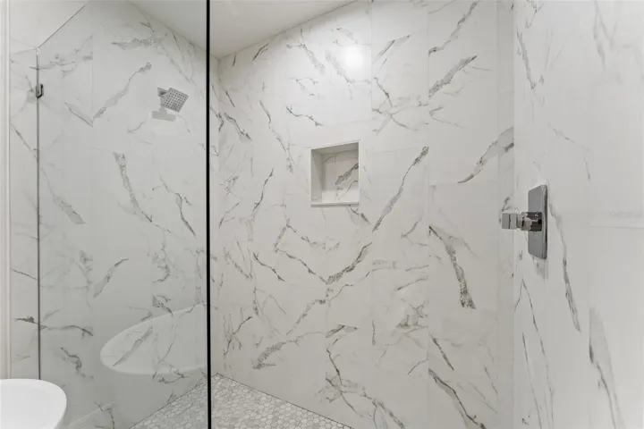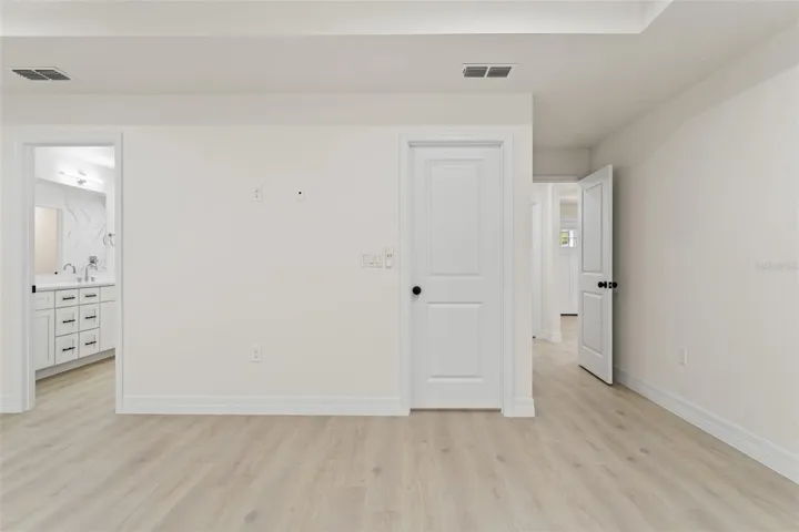 The spacious primary suite easily accommodating even the largest of king-sized furnishings and invites relaxation with beautiful soaking tub, oversized walk-in tiled shower, and an ENORMOUS custom-designed walk-in closet with custom shelving system that merges organization and style effortlessly.