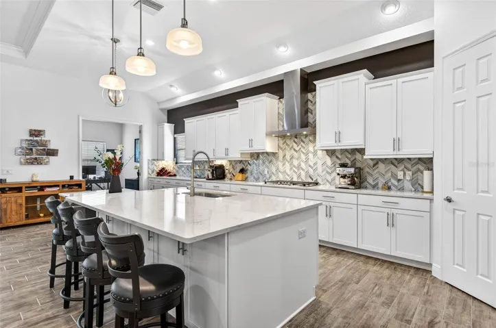 Step inside to 12-foot ceilings, an open and airy layout, and high-end finishes from top to bottom. The gourmet kitchen is a true centerpiece, featuring quartz countertops, shaker-style solid wood cabinetry, a custom backsplash, a gas stovetop, stainless steel appliances, and a large walk-in pantry. The home includes custom window treatments, luxury flooring, 7¼” baseboards, and a built-in laundry room with a sink for added convenience.