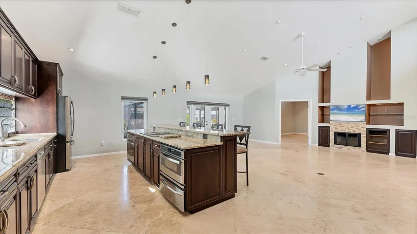 Every room reflects meticulous attention to detail, from custom built-ins on the featured wood burning fireplace wall with designer finishes to the elegant French doors that open to your private outdoor oasis. The covered patio and heated pool are the perfect backdrop for outdoor living—whether lounging, dining al fresco, or soaking up the Florida sunshine.