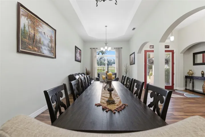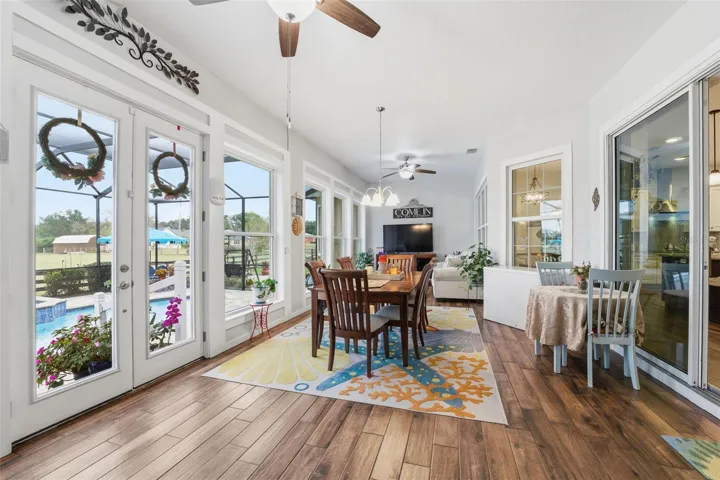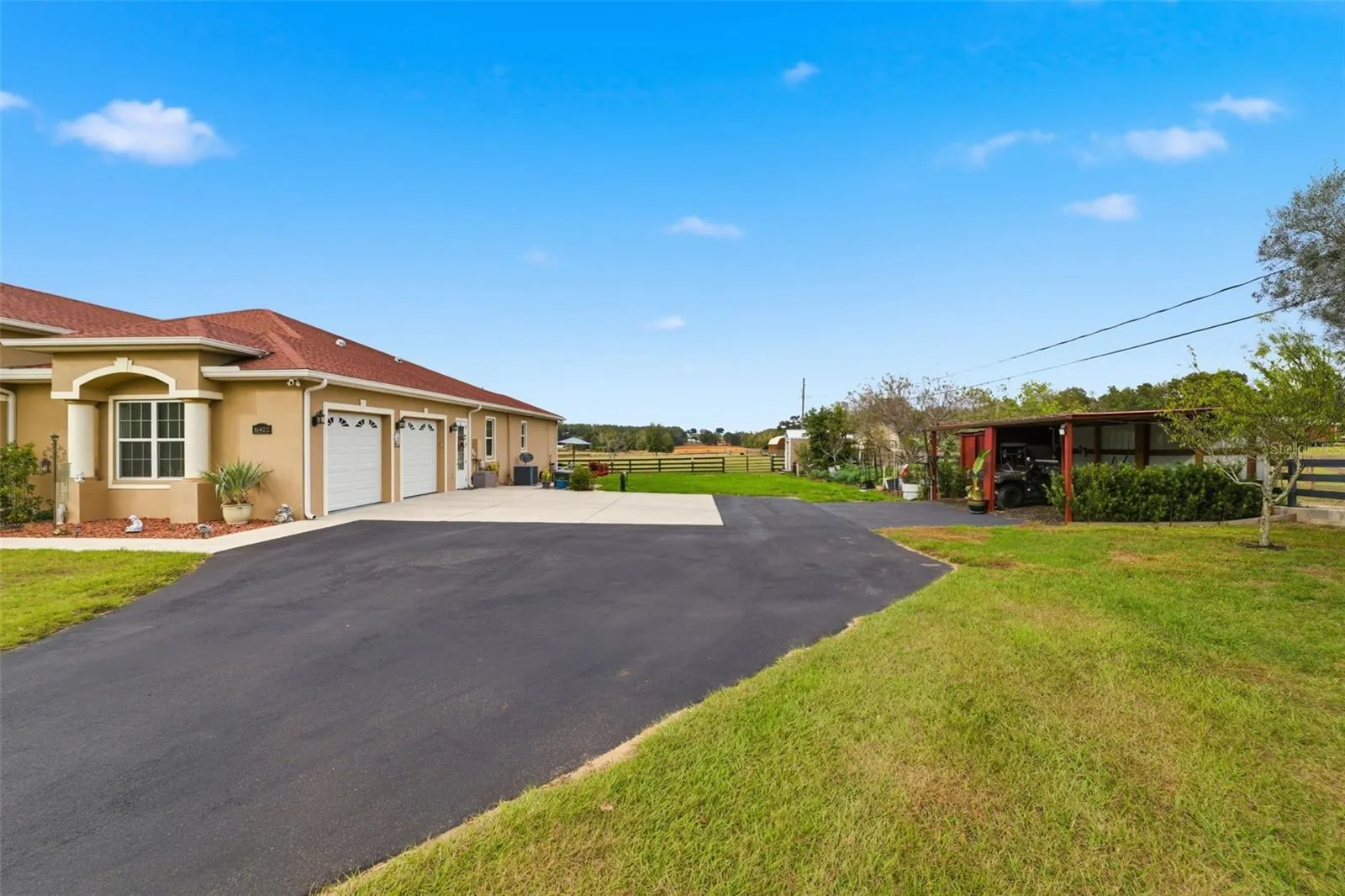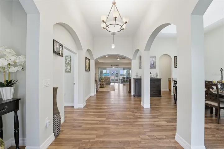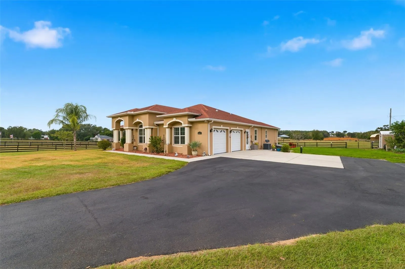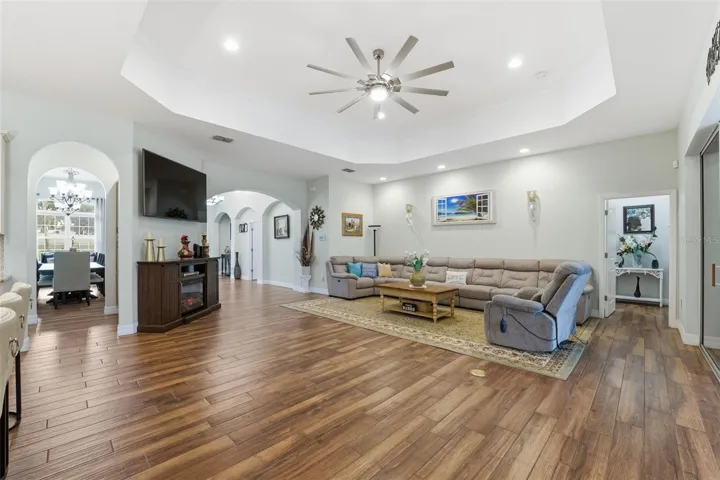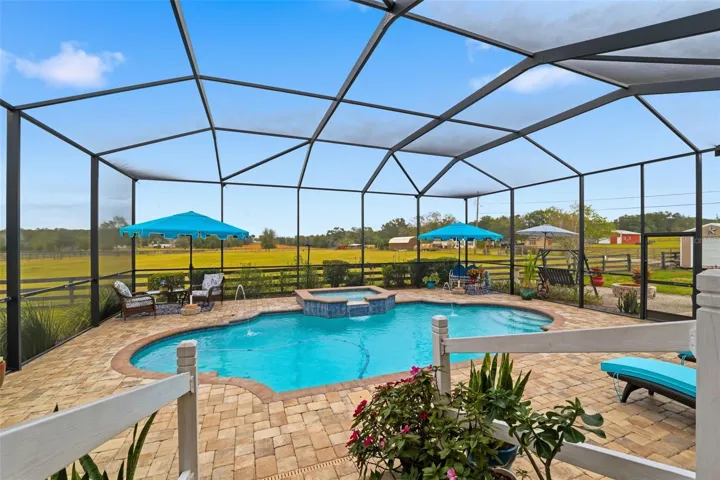 Tucked beyond a secured gate and down a long paved driveway, this beautifully maintained 9.1-acre property immediately welcomes you with its wide open lawn, scattered mature trees, and a peaceful sense of space that sets the tone for the entire home. The paved driveway continues all the way to a 2-car garage with a convenient side entry, along with a utility vehicle overhang on the side for additional covered parking. The inviting front porch—with its smooth textured flooring, tall columns, and elegant double doors topped by an arched transom—leads into a warm foyer filled with natural light from glass-paneled doors and wood-look tile flooring that draws you inward. To the right, the dining room greets you with graceful arches, large windows, and a smooth ceiling before the hallway guides you straight into the heart of the home. The living room offers a bright and open feel with recessed lighting, wood-look tile flooring, and multiple windows, along with access to the sunroom through sliding doors. The kitchen sits just beyond, featuring a breakfast bar, dual sink, stainless appliances, white cabinetry, and recessed lighting, all opening to a cozy breakfast nook with surrounding windows and the same warm flooring. A butler’s pantry leads to a well-appointed laundry room with overhead cabinets for storage. The sunroom provides a peaceful retreat with abundant windows and direct views of the screened heated pool, heated spa, and outdoor surroundings. The primary bedroom offers a serene escape with a tray ceiling, large windows, and an ensuite bathroom with a spacious vanity, walk-in tiled shower, tub, and bright natural light. Other bedrooms offer comfortable living with matching flooring, smooth ceilings, and generous windows, with Bedroom 2 offering dual closets and the additional bathrooms featuring either tub-shower combinations or step-in showers with dual vanities. Outside, enjoy a relaxing patio with a brick fire pit and a storage shed, perfect for both leisure and functionality. Beyond the property, residents can enjoy local attractions such as Downtown Dade City, known for its quaint shops, dining, and historic architecture; the expansive Withlacoochee River Park, offering nature trails, canoeing, and scenic picnic areas; and the popular TreeHoppers Aerial Adventure Park, a family-friendly destination featuring climbing courses and zip lines. These nearby highlights bring convenience, recreation, and charm to the area, enhancing the experience of calling this peaceful property home.
