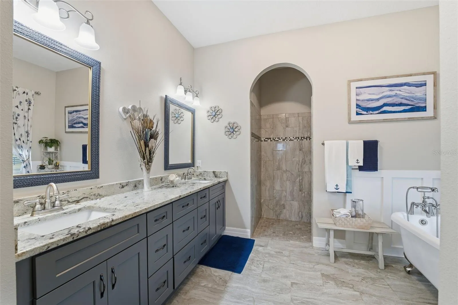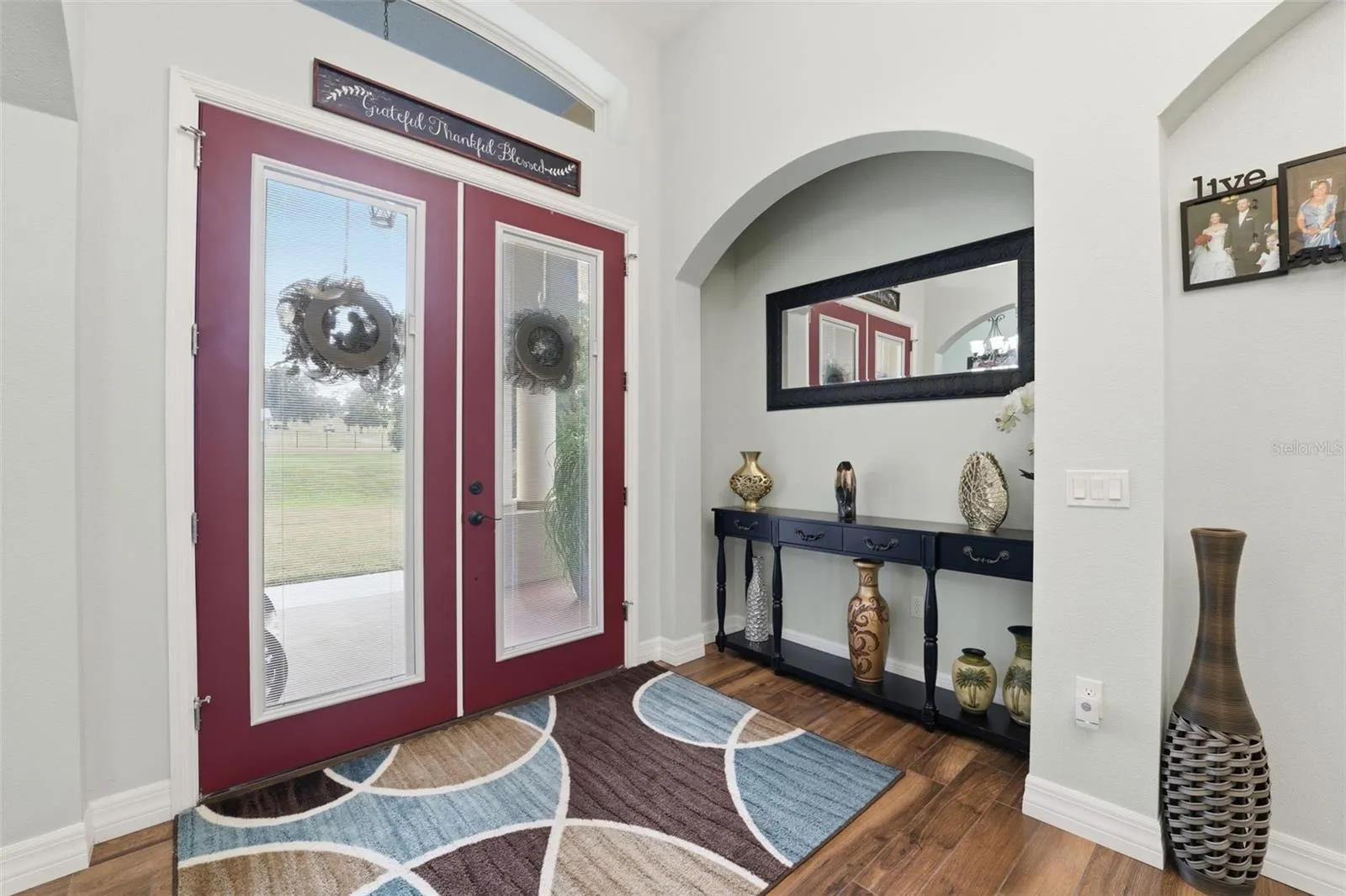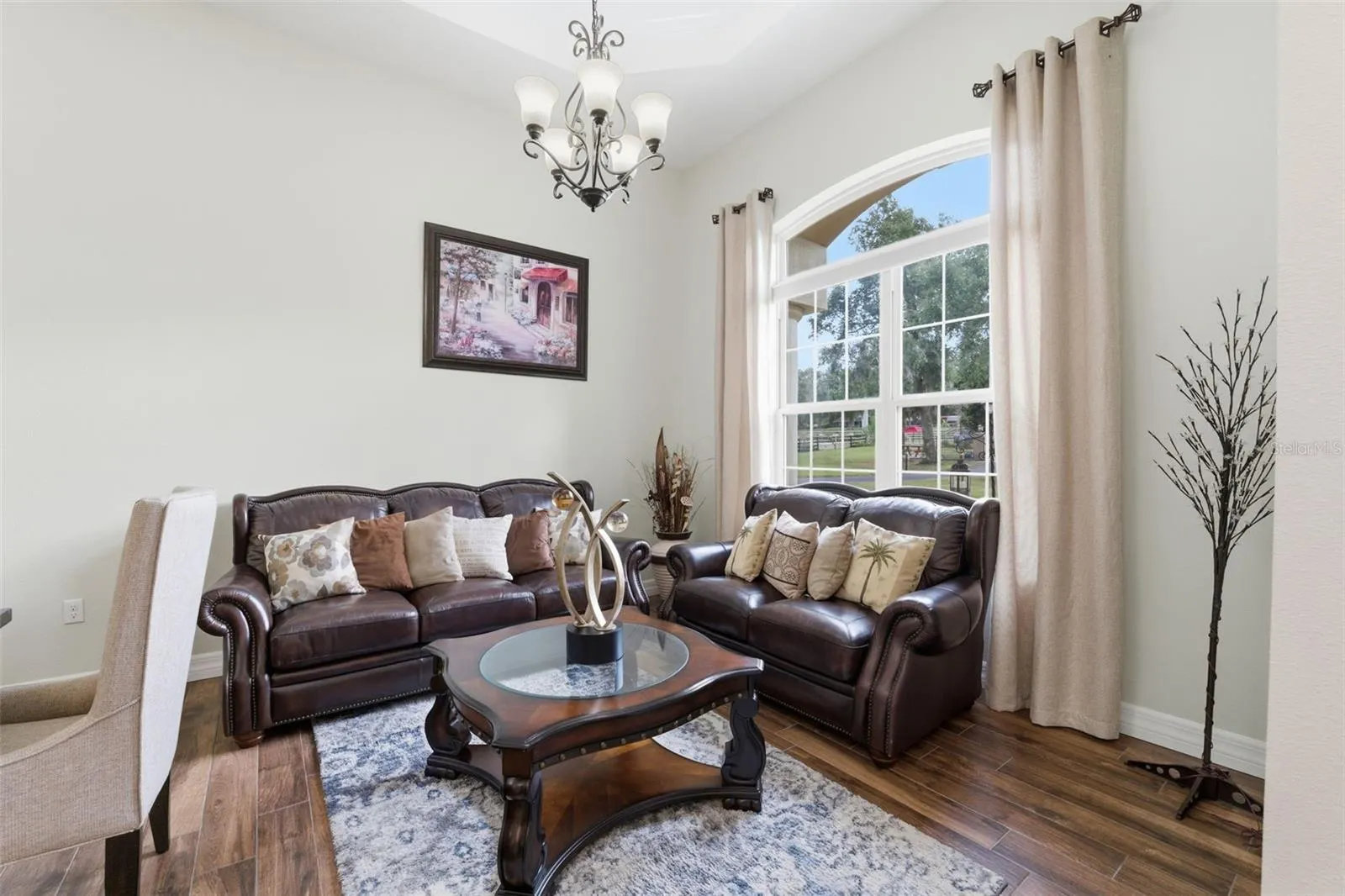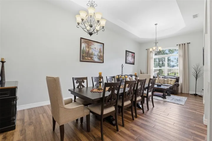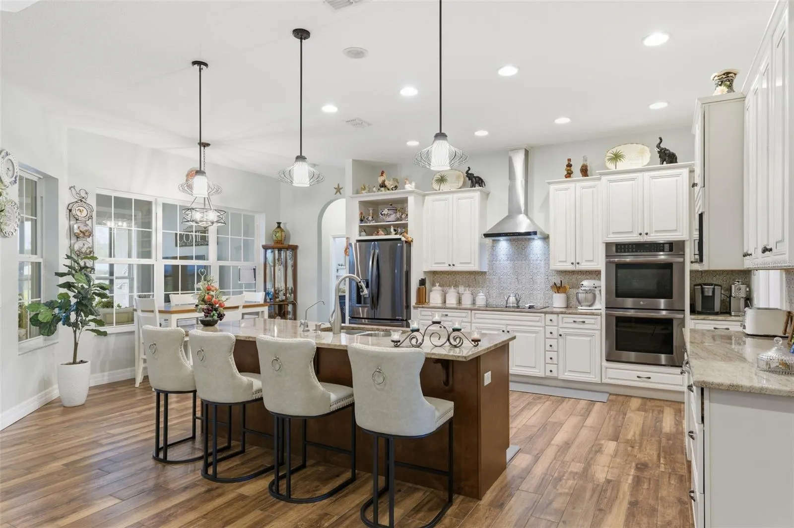 Tucked beyond a secured gate and down a long paved driveway, this beautifully maintained 9.1-acre property immediately welcomes you with its wide open lawn, scattered mature trees, and a peaceful sense of space that sets the tone for the entire home. The paved driveway continues all the way to a 2-car garage with a convenient side entry, along with a utility vehicle overhang on the side for additional covered parking. The inviting front porch—with its smooth textured flooring, tall columns, and elegant double doors topped by an arched transom—leads into a warm foyer filled with natural light from glass-paneled doors and wood-look tile flooring that draws you inward. To the right, the dining room greets you with graceful arches, large windows, and a smooth ceiling before the hallway guides you straight into the heart of the home. The living room offers a bright and open feel with recessed lighting, wood-look tile flooring, and multiple windows, along with access to the sunroom through sliding doors. The kitchen sits just beyond, featuring a breakfast bar, dual sink, stainless appliances, white cabinetry, and recessed lighting, all opening to a cozy breakfast nook with surrounding windows and the same warm flooring. A butler’s pantry leads to a well-appointed laundry room with overhead cabinets for storage. The sunroom provides a peaceful retreat with abundant windows and direct views of the screened heated pool, heated spa, and outdoor surroundings. The primary bedroom offers a serene escape with a tray ceiling, large windows, and an ensuite bathroom with a spacious vanity, walk-in tiled shower, tub, and bright natural light. Other bedrooms offer comfortable living with matching flooring, smooth ceilings, and generous windows, with Bedroom 2 offering dual closets and the additional bathrooms featuring either tub-shower combinations or step-in showers with dual vanities. Outside, enjoy a relaxing patio with a brick fire pit and a storage shed, perfect for both leisure and functionality. Beyond the property, residents can enjoy local attractions such as Downtown Dade City, known for its quaint shops, dining, and historic architecture; the expansive Withlacoochee River Park, offering nature trails, canoeing, and scenic picnic areas; and the popular TreeHoppers Aerial Adventure Park, a family-friendly destination featuring climbing courses and zip lines. These nearby highlights bring convenience, recreation, and charm to the area, enhancing the experience of calling this peaceful property home.