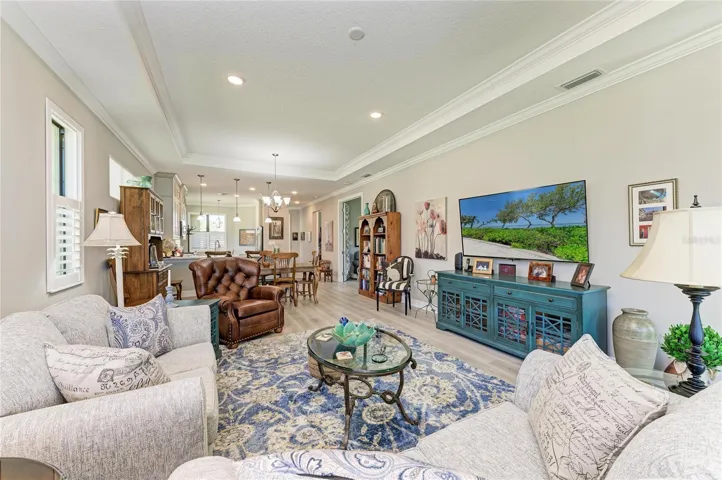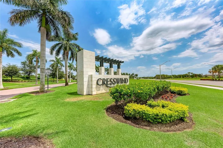 Presenting the “Lido” model located in the premier 55+ amenity packed community of Cresswind, a true Lakewood Ranch gem. This home is simply gorgeous and allows for beautiful natural light to stream in. This smart floor plan features 2 nice sized bedrooms AND a den/office.. the beautiful chef’s kitchen comes with thick quartz countertops, Upgraded GE appliances, soft close drawers, a natural gas stove with double ovens, pendant lighting, contemporary glass tile backspash and soft grey cabinets that reach the ceiling. The quartz waterfall countertop upgrade, easy access pantry and the plantation shutters are an added bonus to this smartly designed space. Move in ready ! Quality finishes at every turn.. nice fans, window treatments and light fixtures are already in place along with an upgraded 220 V outlet in the extended garage to charge your vehicle. A tankless hot water heater, pre plumb for a water softener and an epoxied floor round out the functional garage. You will find a distinctive curb appeal here with an extensive use of brick pavers, a stunning leaded glass front door ,brushed nickel door hardware and lush tropical landscaping. Screened in lanai and a berm homesite allow for privacy and a large pet friendly yard. Cresswind Lakewood Ranch by Kolter Homes is a gated, active adult village located in sunny Lakewood Ranch Florida, the #1 multi-generational community in the nation. Cresswind features a community vibe and homes designed for today’s active adults, an award-winning lifestyle program, resident-only amenities and wide walkways. This pet-friendly community features a lakeside clubhouse overseen by a full-time lifestyle director with multi-purpose event and social spaces, Cresswind SmartFIT Training Center powered by EGYM, yoga studio, art studio with ceramics, game rooms, and various optional social clubs. Outdoor amenities include 6 pickleball courts & 2 tennis courts, 2 bocce courts, a popular dog park, resistance & resort-style pools, a spa, sundeck, event plaza with numerous food trucks and more. The reasonable monthly fee includes yard maintenance, mowing and trimming, irrigation, cable and internet. This is a fantastic opportunity and we look forward to your showing.