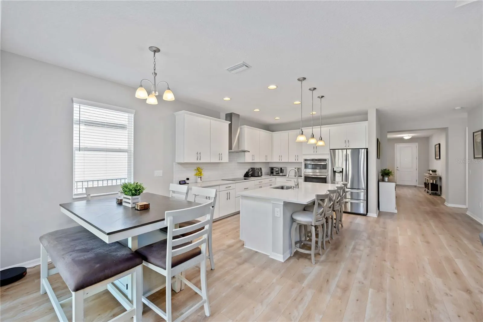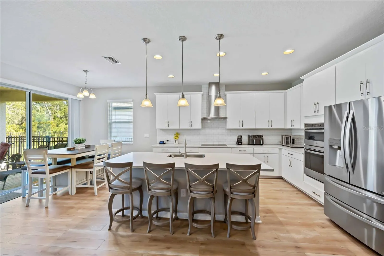 Upon entering the home, you will discover a beautifully designed open-concept floor plan linking the foyer, great room, dining area and kitchen. The white cabinets, tiled backsplash and premium stone countertops combined with the stainless-steel appliances give a clean and modern look, and highlight the views of the lanai. High ceilings, 8ft. doors, expansive windows, and quality finishes throughout the home elevate the sense of space and comfort. The 4 bedrooms and 3 full bathrooms are centered around a versatile living zone. The primary suite is tucked away for added privacy with new flooring, an oversized walk-in shower and large walk-in closet. Secondary bedrooms are also generously sized with new carpeting and full bathrooms with the same modern look as the kitchen.