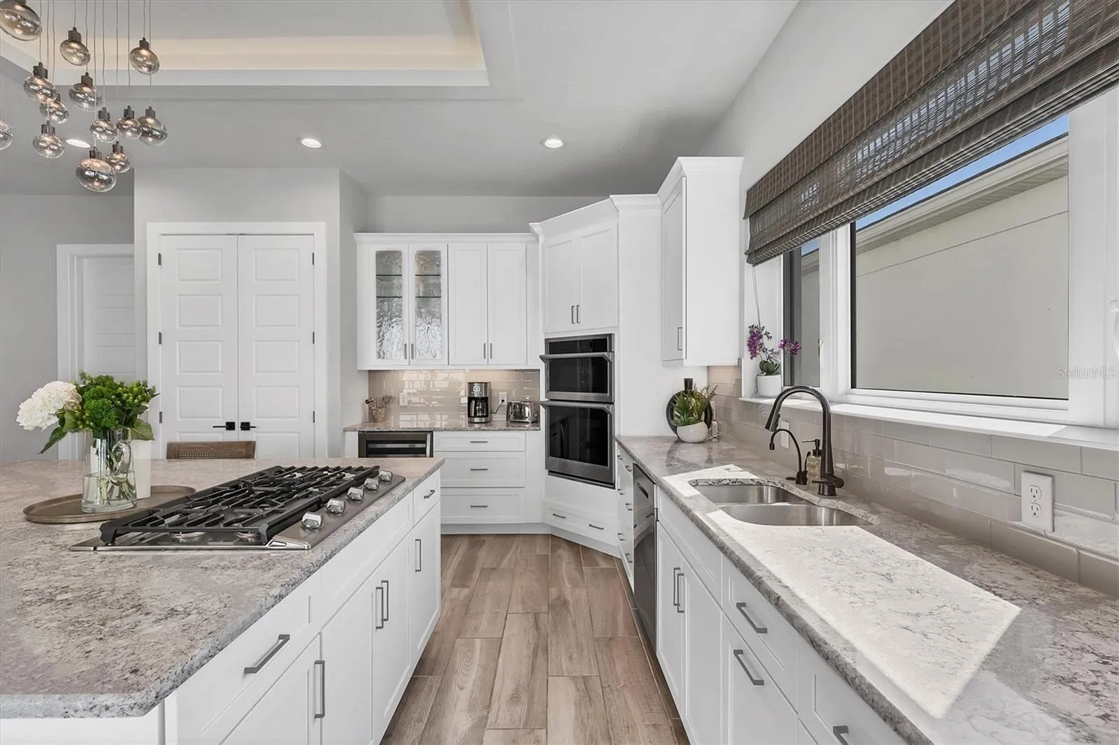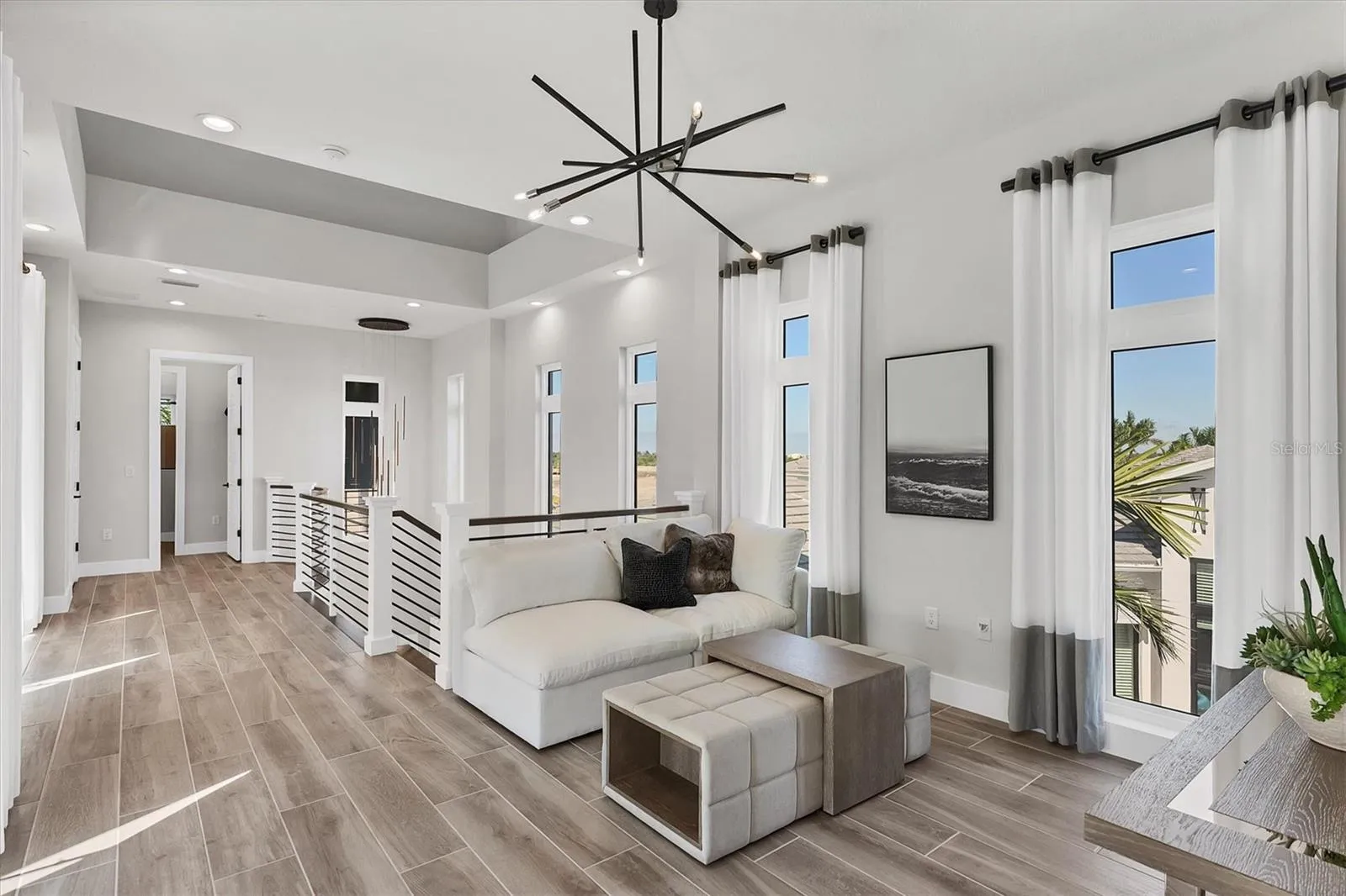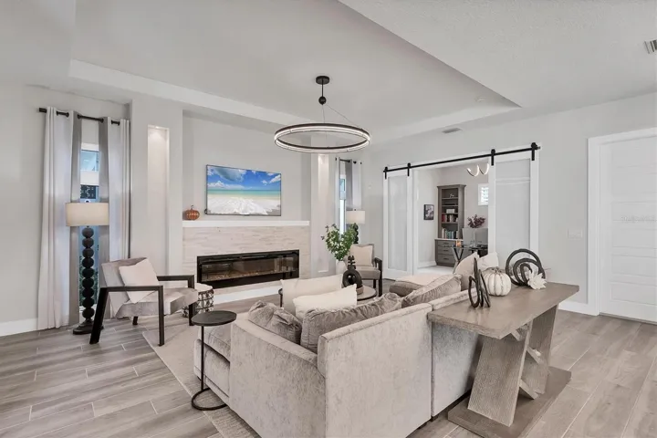 Amazing 2023 built 4 bedroom,. 4 full bathroom, plus home office and 2nd floor loft, 2 car garage, and beautifully TURNKEY FURNISHED. Different than the rest in that it is Furnished, plus Sarasota Bay views from Master bedroom, plus single story completed homes on both sides which is privacy and not looking into others homes, plus loads of nice interior upgrades. All four bedrooms have walk-in closets, three of the bedrooms are upstairs and three of the bedrooms are ensuite. The pool is heated with salt chlorinator, lanai has gas bbq built in, string lights for great ambiance, and outdoor furniture. Home office has glass barn doors and nice custom built in shelving/cabinets. Kitchen has 7×7′ island, gas cooktop with vent, instant hot water at sink, stainless steel Samsung appliances, and wine refrigerator. Master bedroom has balcony, large walk in closet with custom shelving, Master bathroom has enormous walk in shower with dbl rain sprays, two large vanities with built in cabinet, and garden tub. Garage has epoxy flooring and storage shelves. This house also offers several step ceilings, custom window drapes, storage closets, all IMPACT windows and sliding doors. Aqua Lagoon is GATED, golf cart ride to IMG Golf Club, minutes from Detwiler Farm market, Public, Target, and IMG Academy. HOA fee includes lawn care, wifi, cable, community pool, gate.
