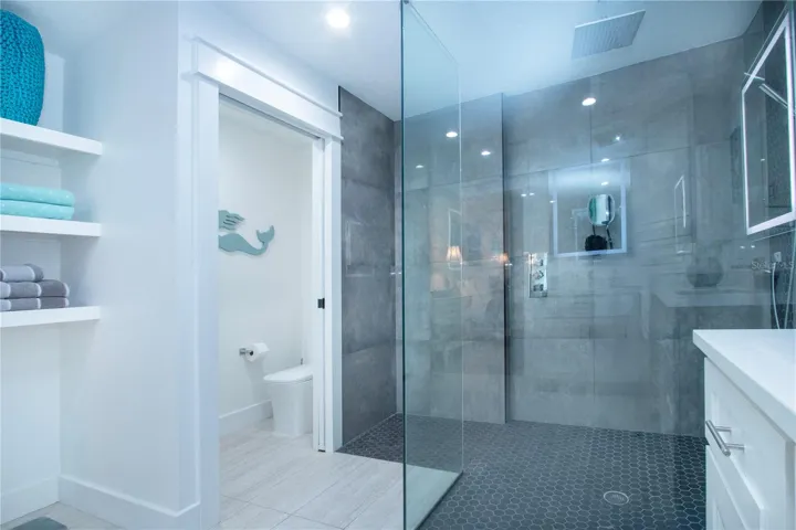 Bathrooms feature quartz vanities, waterfall faucets, glass tile showers, one with a LED blue-light rain shower head. Touch-screen mirrors with changing light settings.