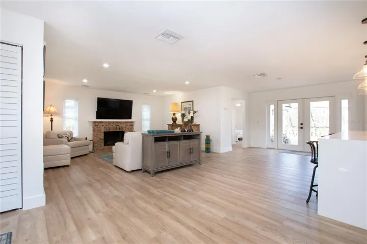 Open and inviting living/dining/kitchen layout anchored by a wood-burning fireplace.