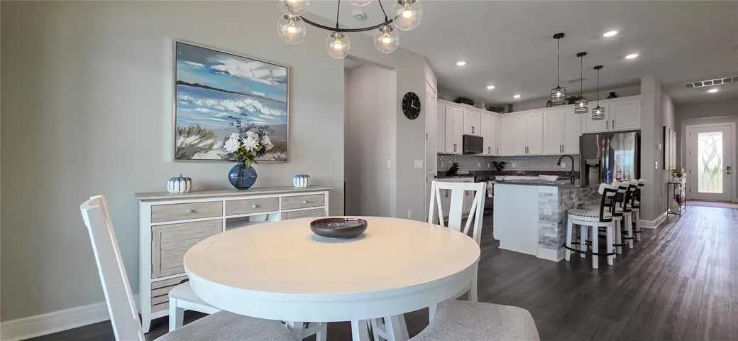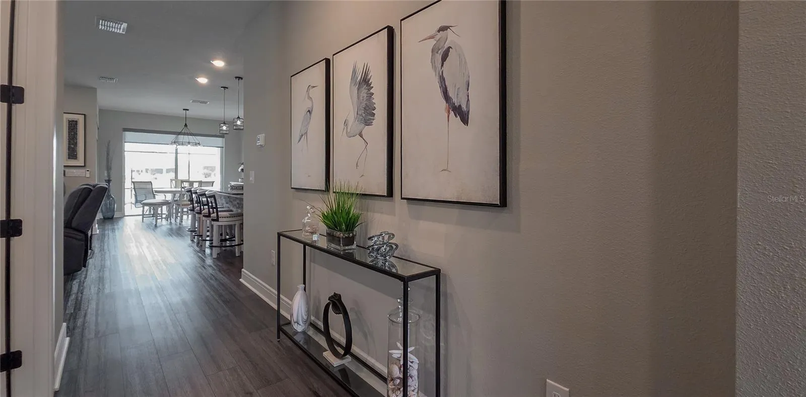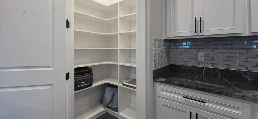 From the moment you step through the custom glass front door, you’ll be greeted by light-filled living spaces, neutral tones, and designer upgrades throughout. The open-concept kitchen showcases custom pantry shelving, a tile backsplash, and stone accents on the island—perfect for cooking and entertaining alike. The spacious great room flows effortlessly to the extended covered lanai, where weather-resistant rain shades and an electric heated saltwater pool create the ultimate outdoor retreat.