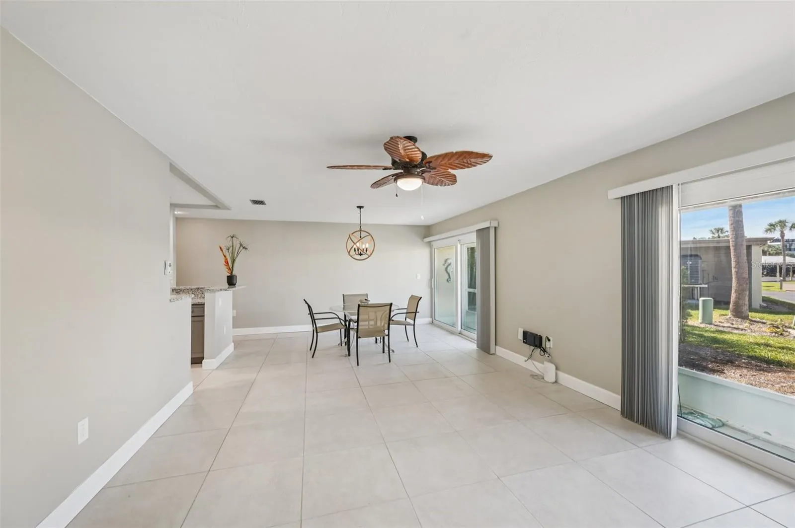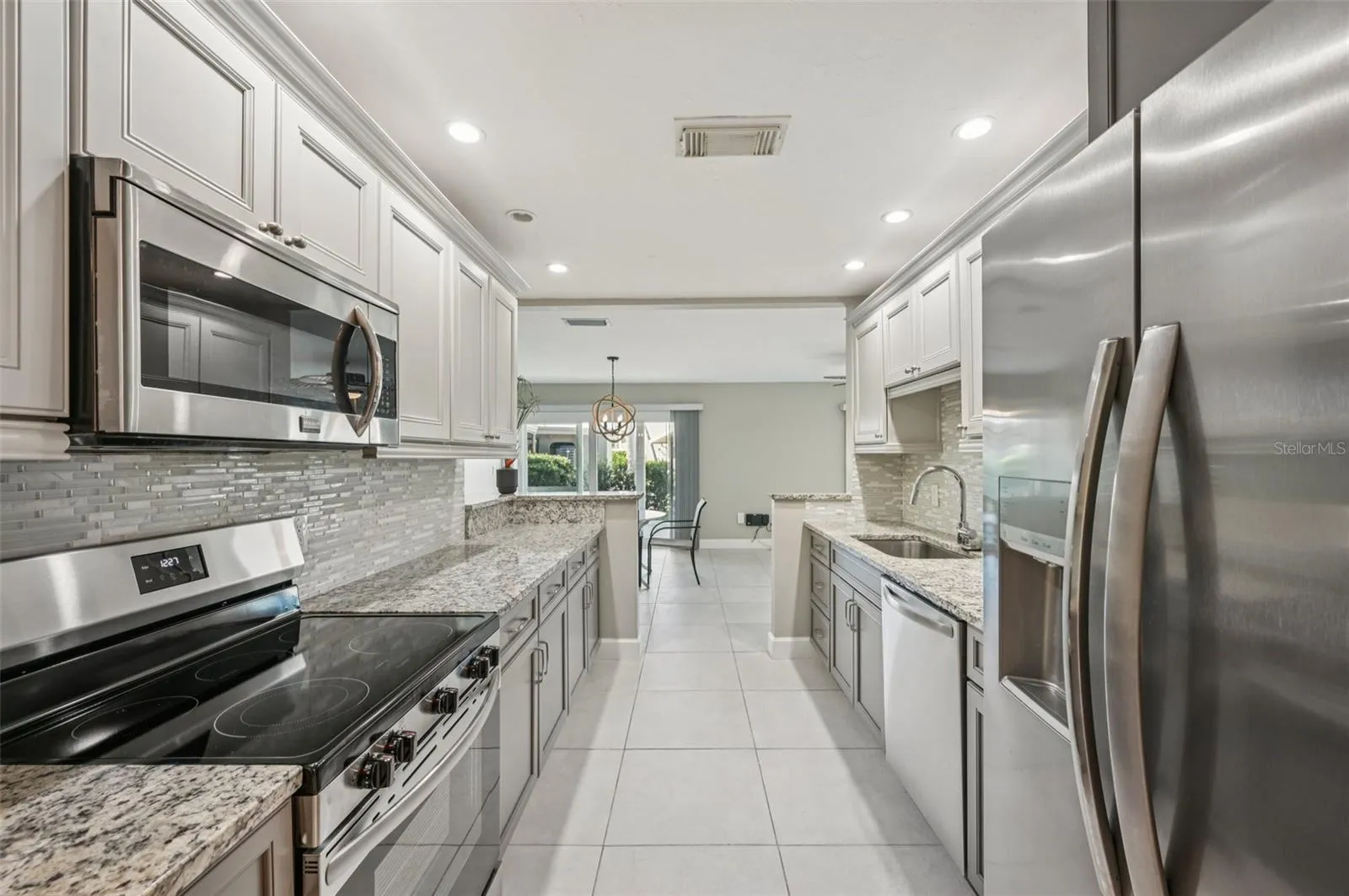 Inside, the home has been tastefully remodeled with tile flooring throughout, a refreshed kitchen featuring all-new lower cabinets with stone countertops, complemented by newly painted upper cabinets in the same high-quality construction and style for a seamless look. Stainless steel appliances complete the modern kitchen design. Both bathrooms have been completely renovated for a clean, contemporary feel.