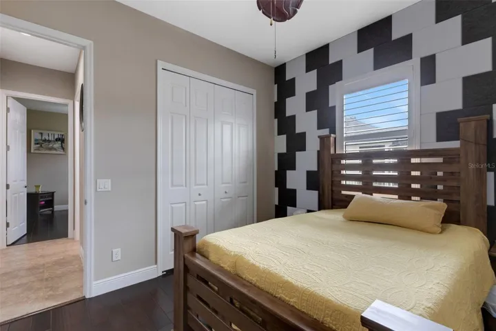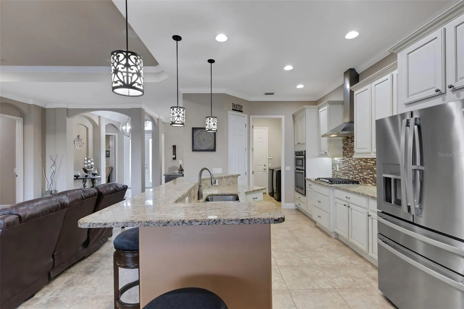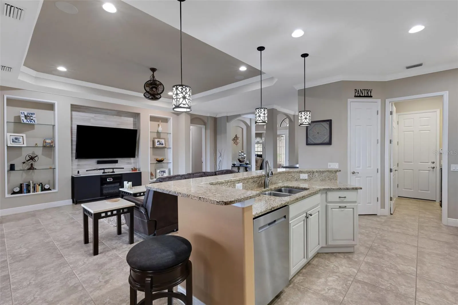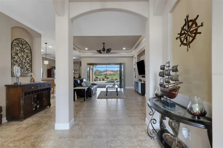 Designed for comfort and style, this open-concept home showcases a brand-new 2024 roof with seamless gutters, elegant tray and barreled ceilings, crown molding, plantation shutters, and wood-planked outdoor ceilings. Tile flooring runs throughout the main living areas, with wood floors in the bedrooms, offices, and bonus room — no carpet anywhere.