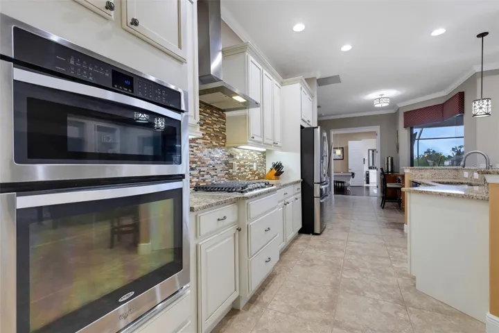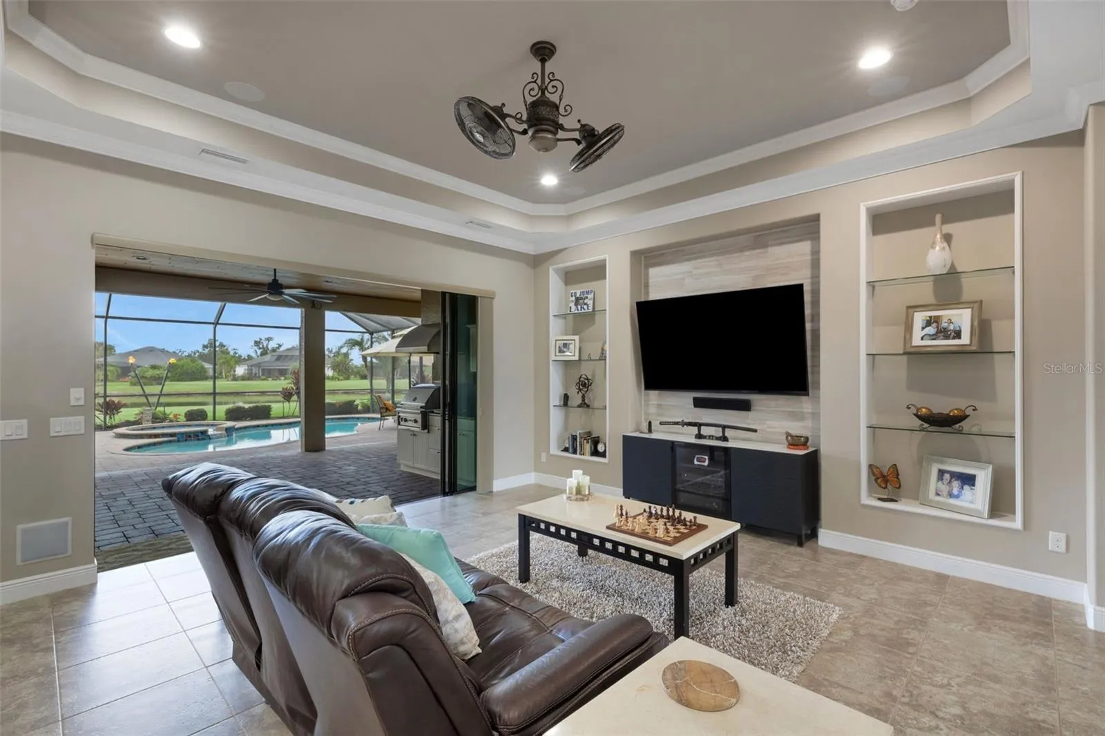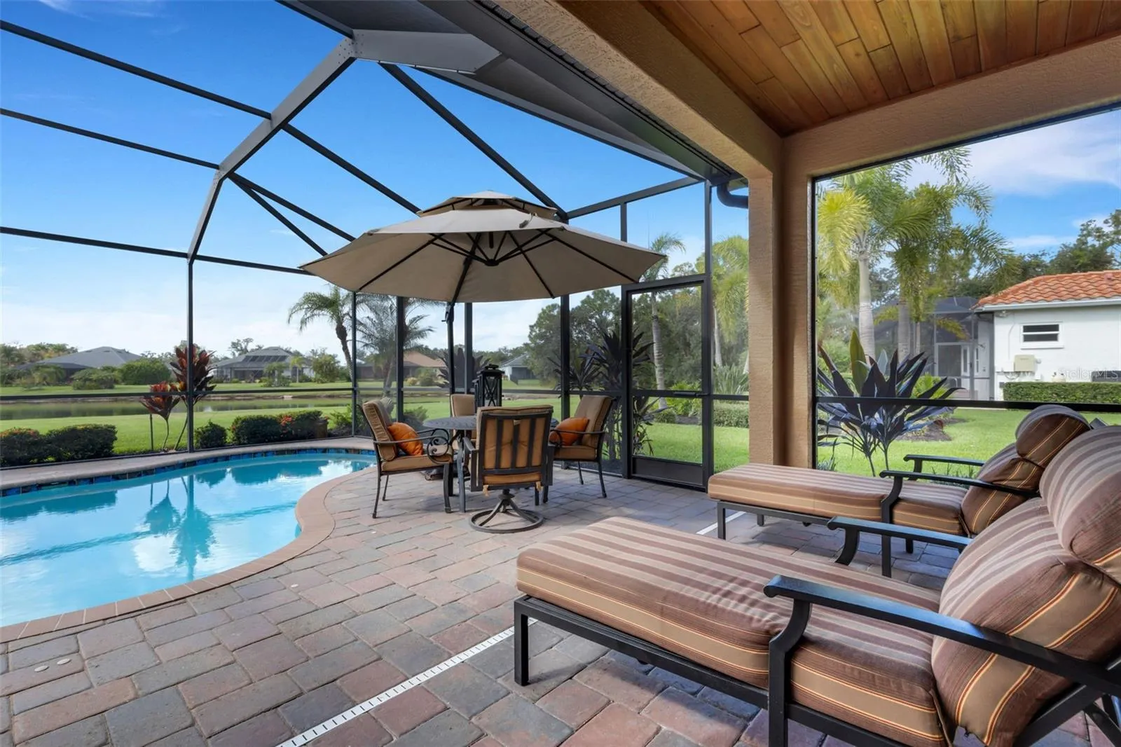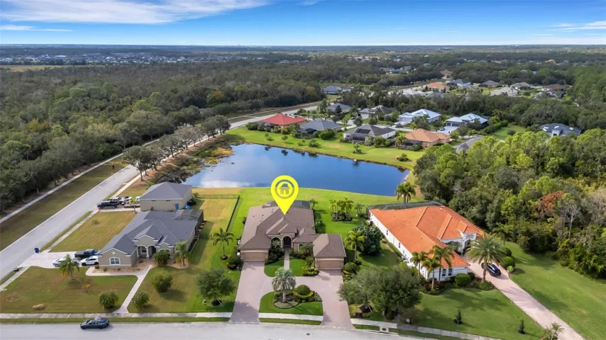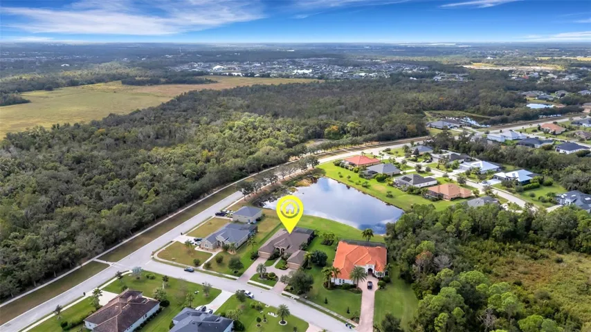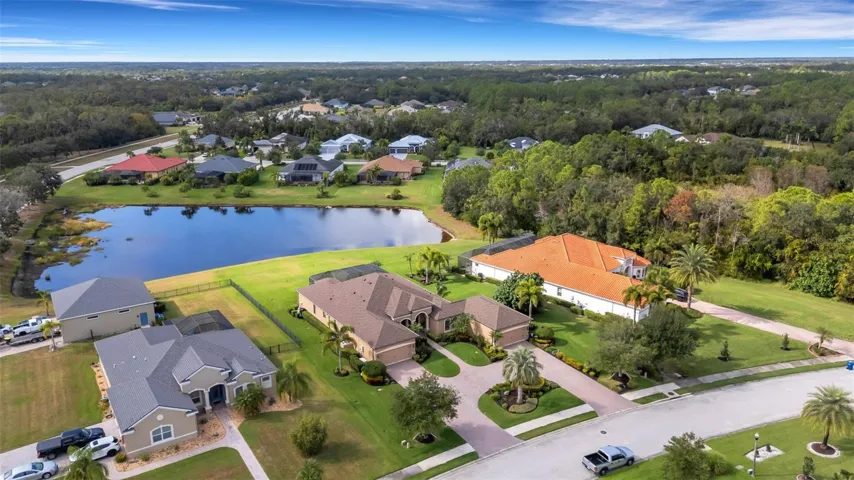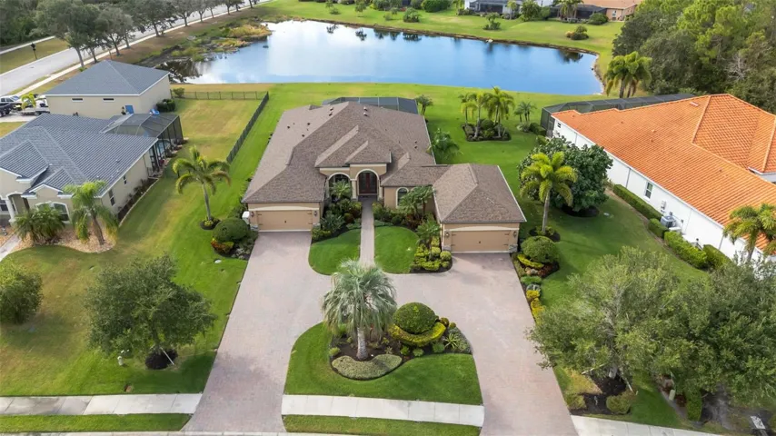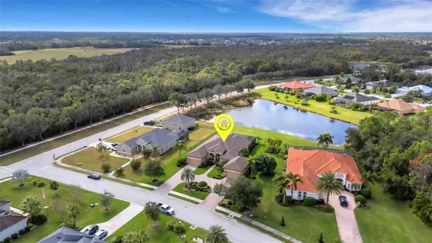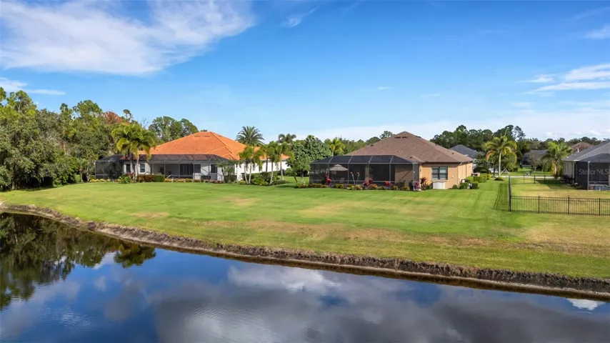 Step through the 12-foot pocketing sliding glass doors to your backyard retreat, complete with a large covered porch, no-see-um screened lanai, outdoor kitchen, and heated pool and spa overlooking a tranquil pond. At night, the propane-fueled tiki torches add warmth and ambiance, making this outdoor space perfect for relaxing or entertaining under the Florida sky. The beautifully landscaped .6-acre lot provides excellent privacy with no rear neighbors and sits outside the flood zone.