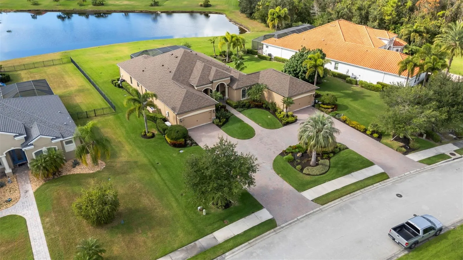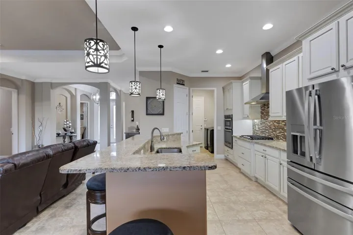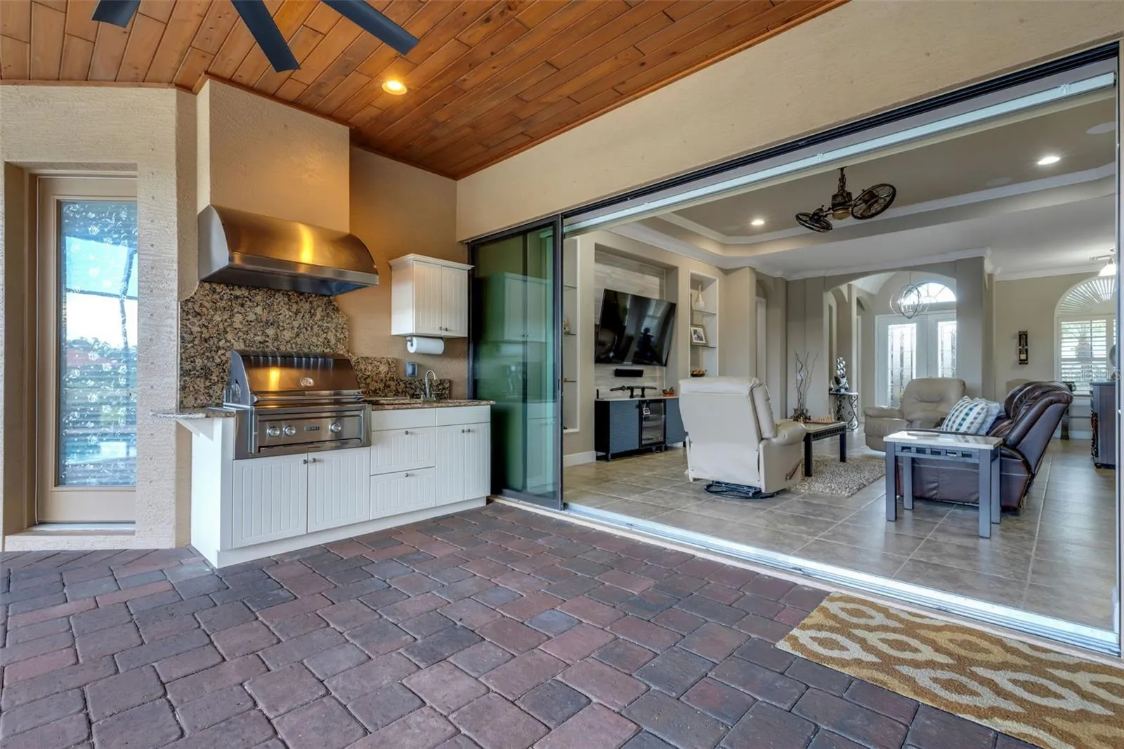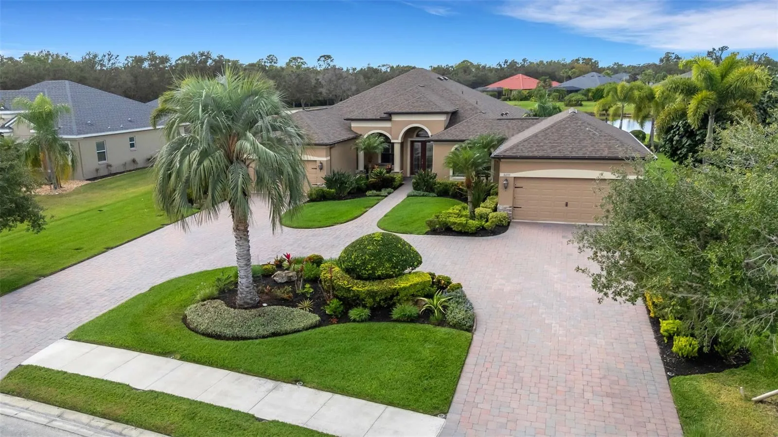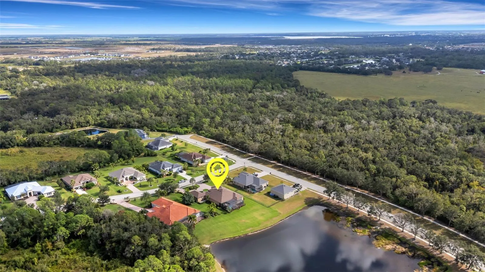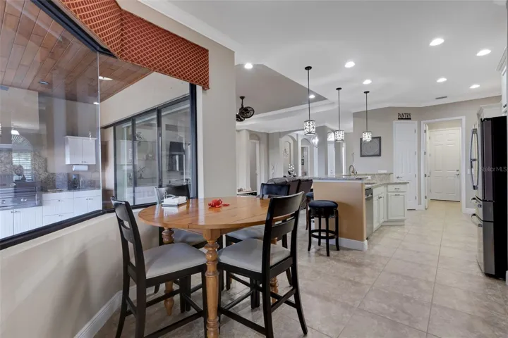 Step through the 12-foot pocketing sliding glass doors to your backyard retreat, complete with a large covered porch, no-see-um screened lanai, outdoor kitchen, and heated pool and spa overlooking a tranquil pond. At night, the propane-fueled tiki torches add warmth and ambiance, making this outdoor space perfect for relaxing or entertaining under the Florida sky. The beautifully landscaped .6-acre lot provides excellent privacy with no rear neighbors and sits outside the flood zone.