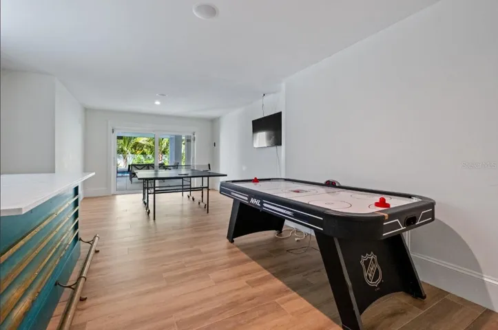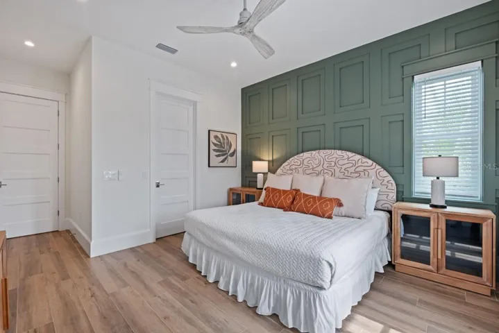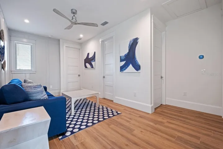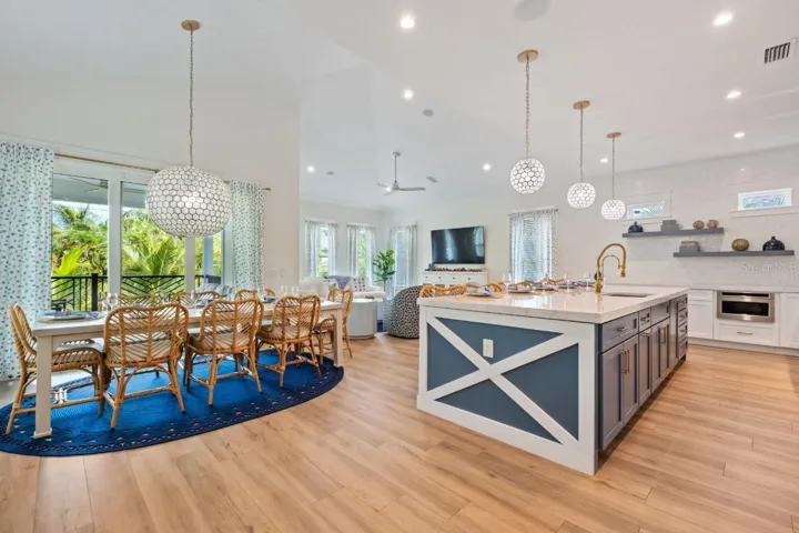 Welcome to Boundless Waves, a new, custom-built coastal estate that perfectly captures the essence of luxury island living on beautiful Anna Maria Island. This exceptional six-bedroom, six-and-a-half-bath residence spans over 3,500 square feet and was thoughtfully designed with no expense spared and no detail overlooked. Every inch of this home reflects superior craftsmanship, from the extensive custom millwork and wood trim to the refined finishes that create an atmosphere of timeless coastal elegance. The open-concept floor plan is bathed in natural light and anchored by a stunning great room with soaring ceilings, shiplap accents, and wide-plank flooring that flows seamlessly throughout. The gourmet kitchen is a showpiece of design and function, featuring professional-grade appliances, a large quartz island, custom cabinetry, and designer lighting—perfect for entertaining or gathering with family.
