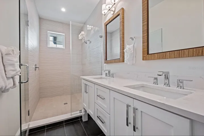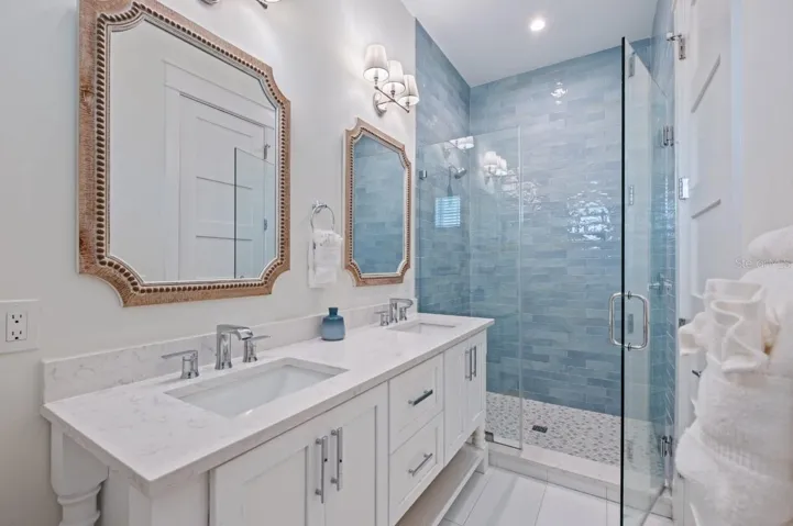 Each bedroom is its own private retreat, complete with an ensuite bath, custom tilework, and spa-like features. The primary suite offers a serene escape with a luxurious bathroom, dual vanities, and direct access to a private balcony. Every detail has been considered, blending modern comfort with coastal sophistication.