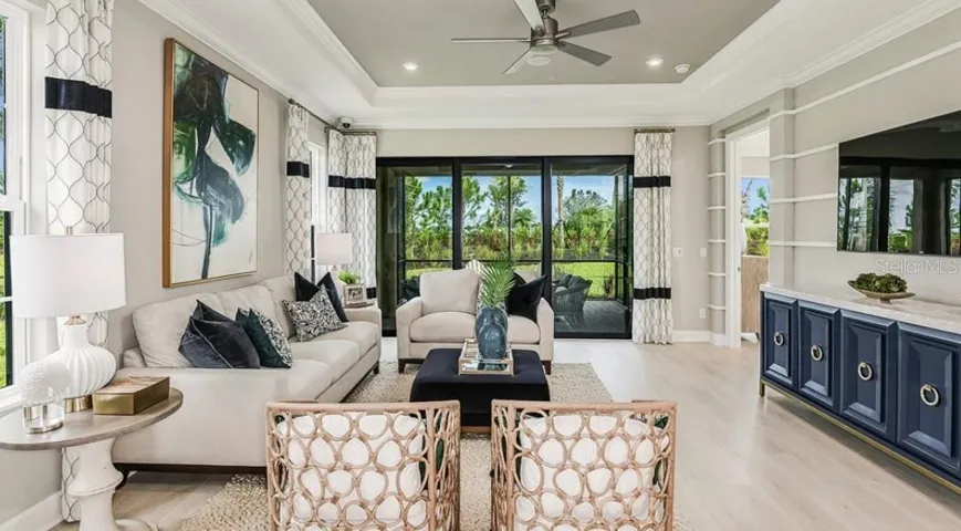 Under Construction. What’s Special: Oversized Garage | Dedicated Study. New Construction – February Completion! Built by Taylor Morrison, America’s Most Trusted Homebuilder. Welcome to the Arezzo at 16215 Isola Place in Esplanade at Azario Lakewood Ranch. This stunning new villa blends thoughtful design with elegant details. Step inside through the side entry and discover an open, spacious layout perfect for everyday living and entertaining. The designer kitchen features a breakfast bar accented with pendant lighting and overlooks the dining area and great room, which flows seamlessly to the covered, screened lanai through sliding glass doors. Whole-house impact windows provide peace of mind, while crown molding adds a refined touch throughout. Luxury vinyl plank flooring extends through the main living areas and into the serene primary suite, complete with an en-suite bath and a two-sided walk-in closet. On the opposite side of the home, you’ll find two secondary bedrooms, a full bath, and a versatile study. Additional Highlights Include: Study in place of flex, double pocket doors at study, 8′ interior doors, extended screened lanai, second sink at secondary bath, tray ceilings at great room, dining, study, and primary suite, and 4′ garage extension. Photos are for representative purposes only. MLS#A4670937