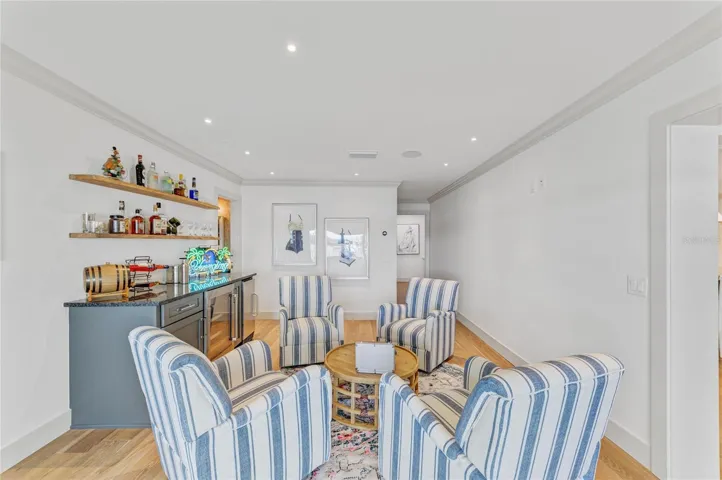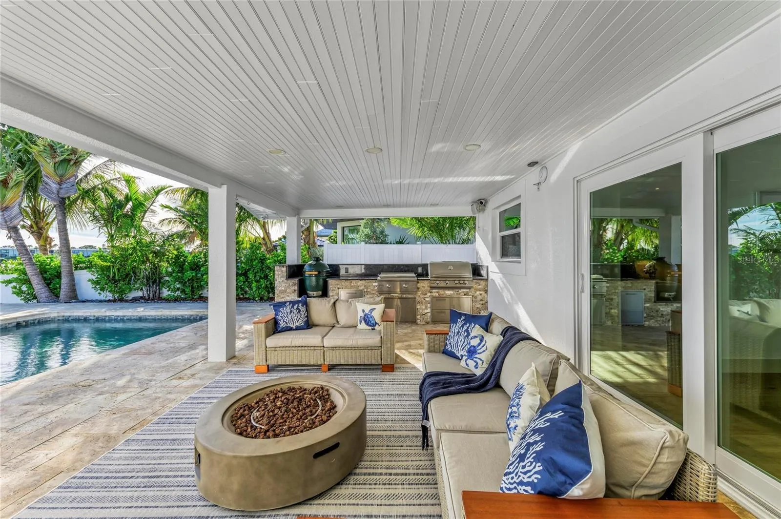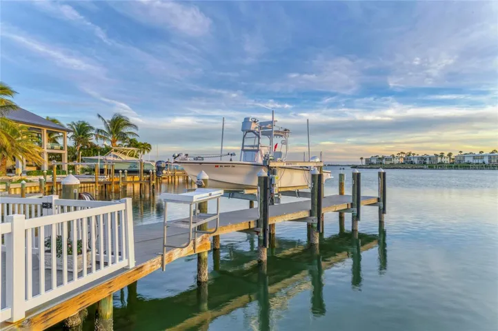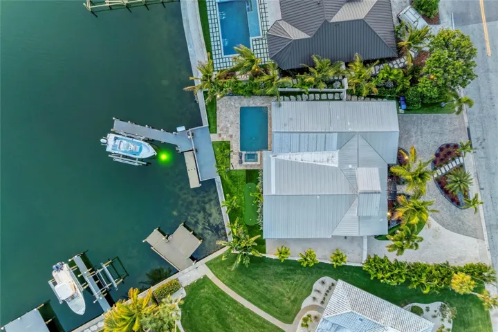 Outdoors, the home transforms into a private waterfront paradise. Enjoy a saltwater pool and spa, a full outdoor kitchen, and your own putting green—all overlooking sparkling water views where dolphins are frequent visitors. Boaters will appreciate the 16,000-lb boat lift, deep water access, and plenty of side-yard space for additional toys, including a 50-amp RV hookup and room for a boat or trailer.