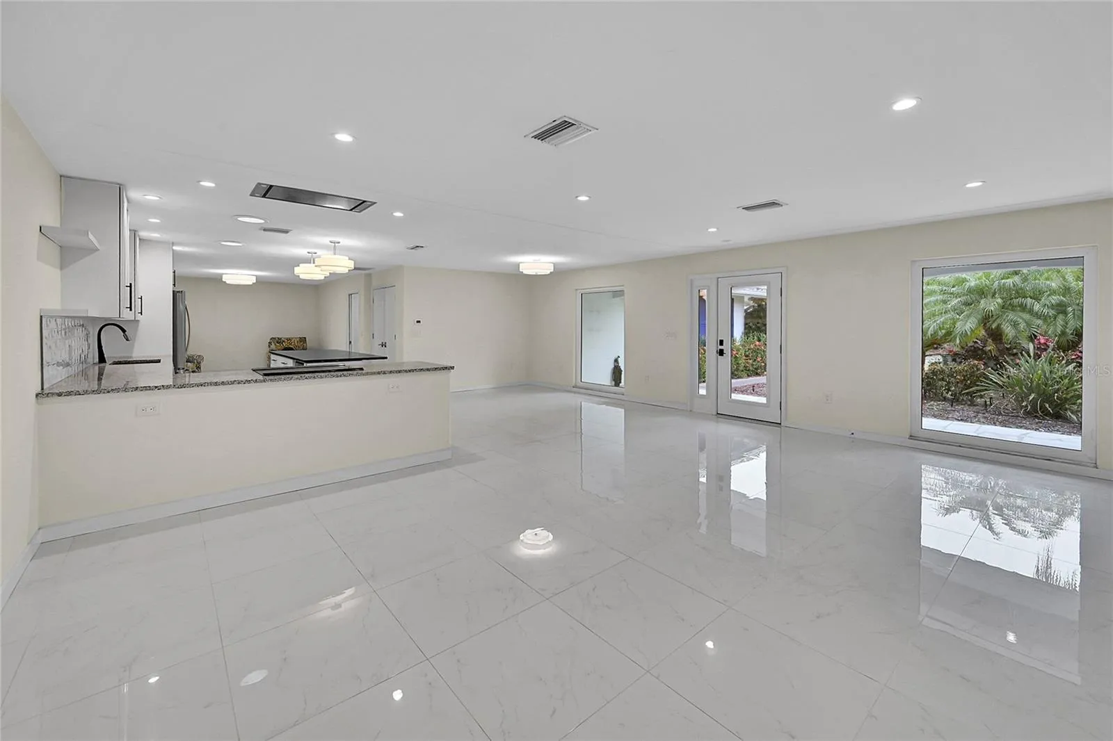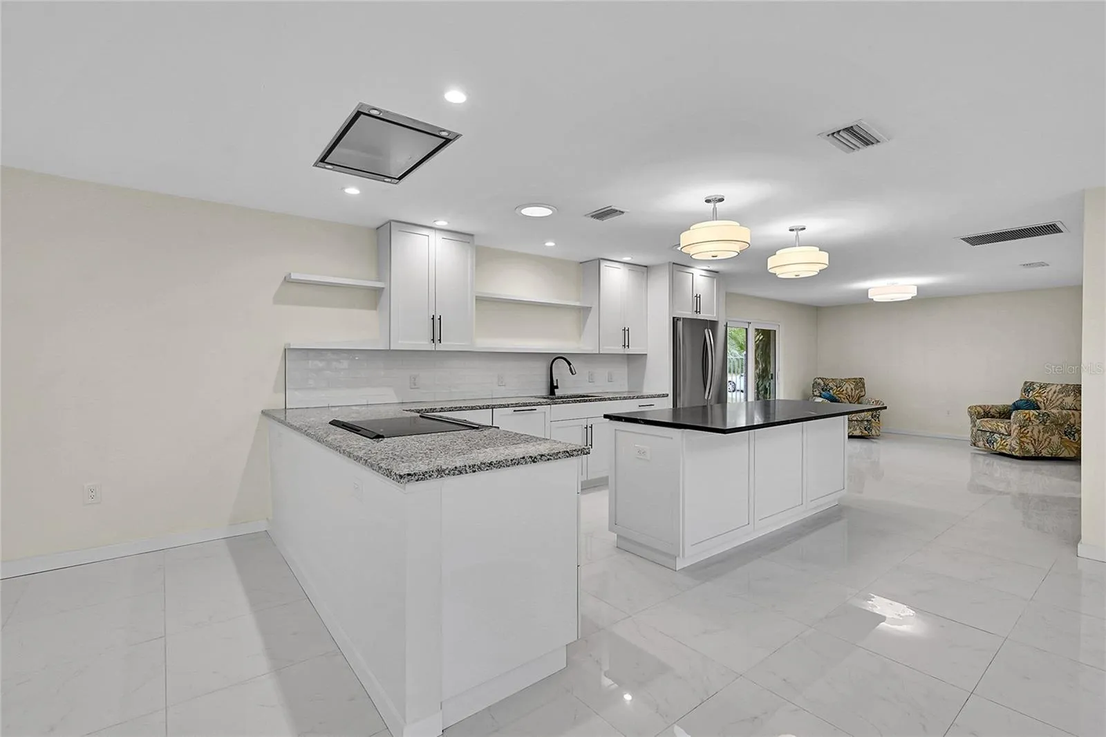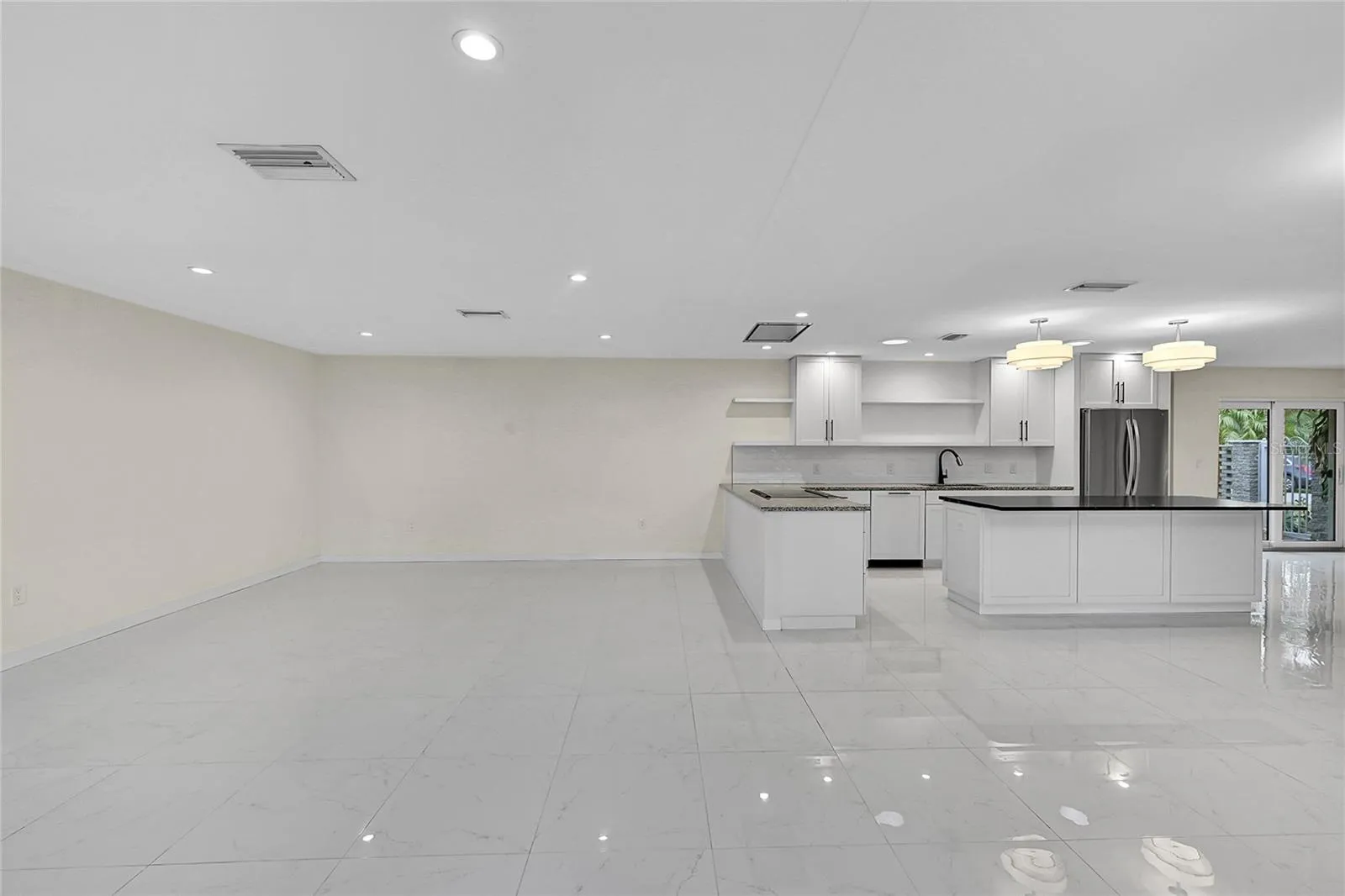 The interior showcases an open floor plan, highlighted by a contemporary kitchen equipped with stainless steel appliances, an oversized center island, and elegant finishes. The living area, equipped with recessed lighting and elegant tile floors, offers a sophisticated environment for both relaxation and entertainment. This home provides numerous impact windows allowing tons of natural light creating a light and bright atmosphere. The seamless open flow between spaces enhances the home’s functionality, making it ideal for entertaining as well as daily enjoyment.
