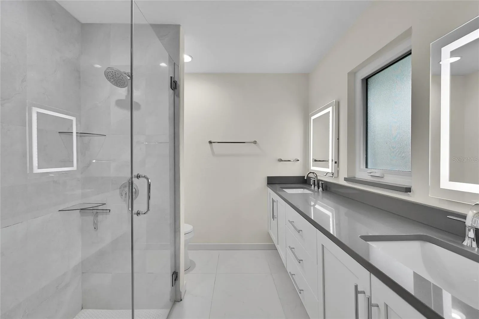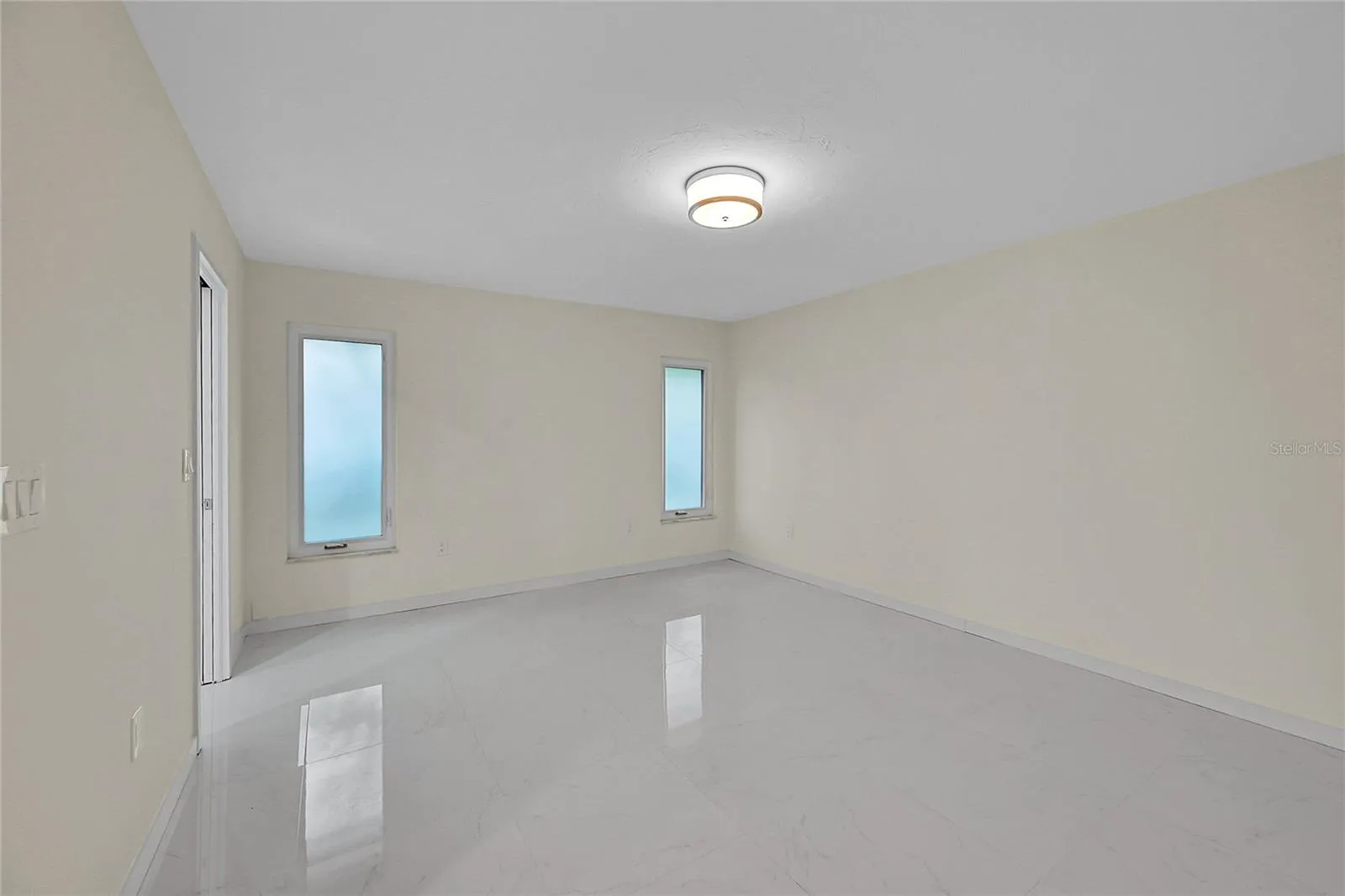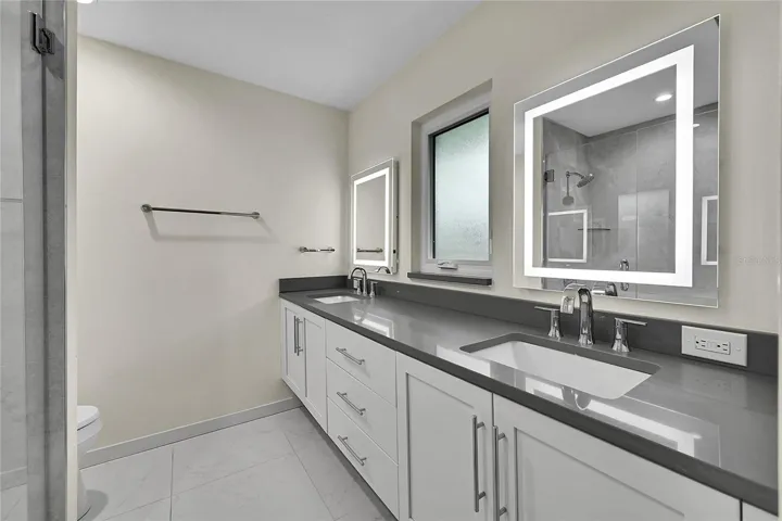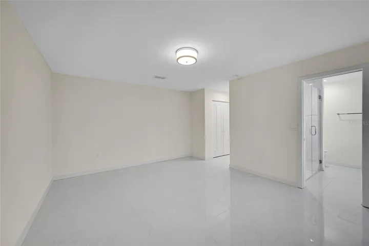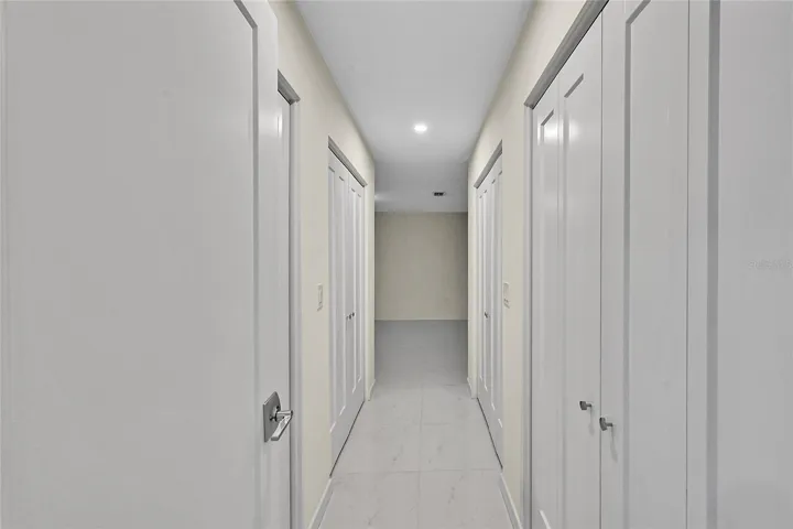 The interior showcases an open floor plan, highlighted by a contemporary kitchen equipped with stainless steel appliances, an oversized center island, and elegant finishes. The living area, equipped with recessed lighting and elegant tile floors, offers a sophisticated environment for both relaxation and entertainment. This home provides numerous impact windows allowing tons of natural light creating a light and bright atmosphere. The seamless open flow between spaces enhances the home’s functionality, making it ideal for entertaining as well as daily enjoyment.