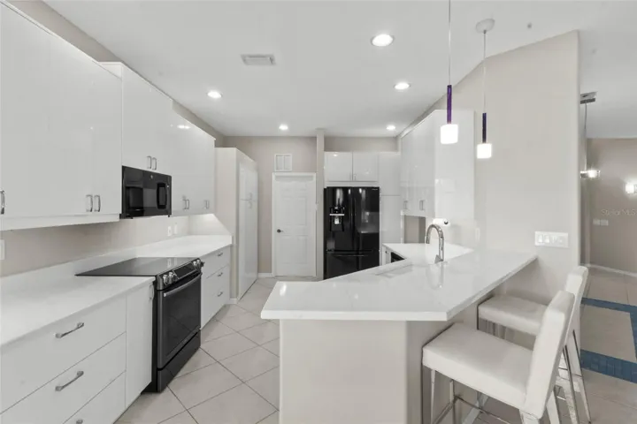 One or more photo(s) has been virtually staged. A significant price improvement meets a refreshed interior, with new paint enhancing the heart of the home. Welcome to this beautifully maintained 3-bedroom, 2-bath home with a den, tucked away on an oversized cul-de-sac lot in the vibrant 55+ gated community of Lakeridge Falls. With 2,186 square feet, this inviting residence offers peaceful scenic lake views, 24-hour guard security, and true maintenance-free living. The heart of this home is its beautifully upgraded, contemporary kitchen featuring sleek, high-gloss Euro-style cabinetry that delivers a clean, modern aesthetic with exceptional storage. Every cabinet and drawer is soft-close, and the pantry is outfitted with custom pull-outs and deep storage drawers — making organization effortless and maximizing every inch of space. Integrated under-cabinet lighting enhances the polished look and illuminates the expansive quartz countertops, creating the perfect workspace for cooking and entertaining. The layout flows effortlessly, anchored by a spacious peninsula with additional storage and ideal seating options. Newer appliances, a deep modern basin sink, and thoughtfully designed cabinetry give this kitchen both style and function — making it a true showpiece within the home. The spacious living area includes a modern custom feature wall with an electric fireplace and a working surround-sound system, adding warmth and style. The primary suite is a retreat of its own, complete with a second electric fireplace and a stunning remodeled bath showcasing an oversized walk-in shower, Kohler Smart Shower system, frameless glass, dual shower heads, body sprays, navy quartz surfaces, and elegant designer lighting. Enjoy the tranquil Florida lifestyle from the enclosed and screened lanai, where sweeping water views make every day feel special. Additional perks include a newer AC (2023), a one-year home warranty, and a pre-listing inspection with completed repairs and receipts provided to the buyer for peace of mind. Residents of Lakeridge Falls enjoy resort-style amenities, including a heated pool, spa, fitness center, card room, bocce courts, a charming sand beach, and a newly renovated clubhouse. All just minutes from University Parkway shopping and dining, SRQ Airport, downtown Sarasota, and world-famous beaches. Warm and welcoming—this is the perfect place to call home.