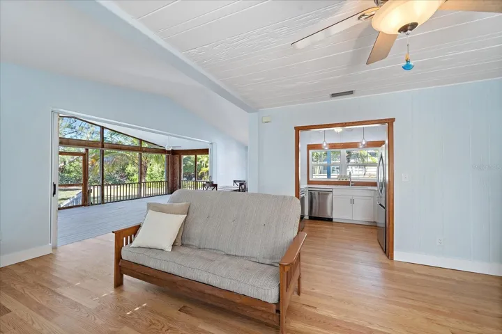 Offering two bedrooms, two bathrooms, and approximately 1,180 square feet, the home retains timeless island character with original cypress walls and ceilings, abundant windows, and a wood-burning fireplace that anchors the living space. A standout feature is the 15×33 rear-facing covered and screened lanai, providing approximately 510 square feet of under-roof outdoor living with pitched ceilings, fans, sun shades, and fully pocketing sliding glass doors, with the flexibility to incorporate this space into additional interior living if desired.