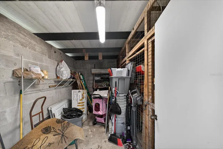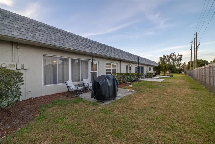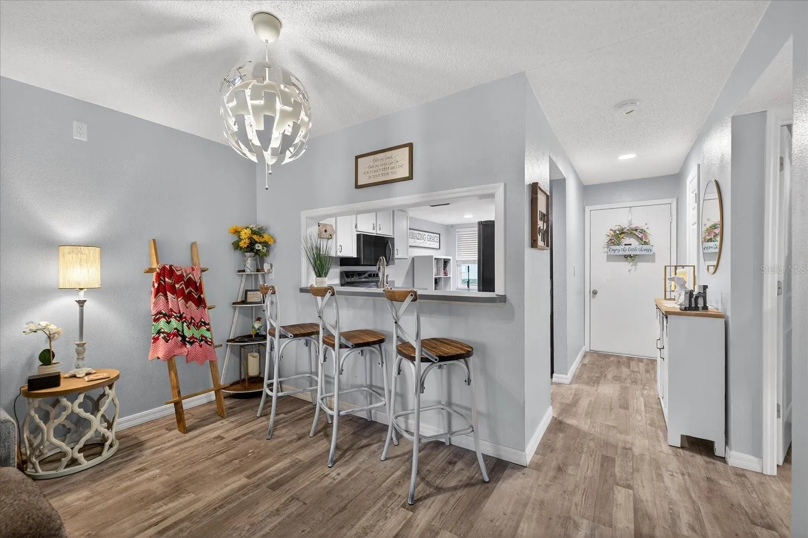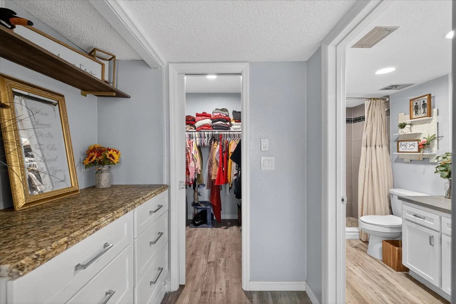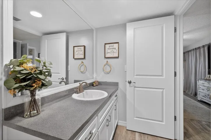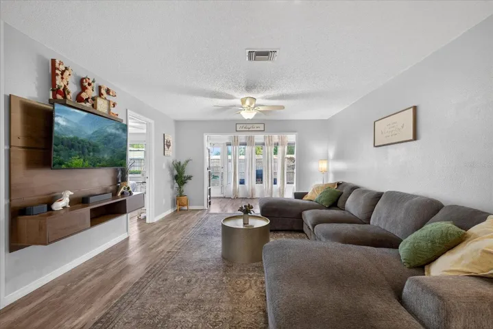 Step inside to a bright, welcoming interior featuring a neutral color palette and stylish luxury vinyl flooring throughout the living areas—no carpet anywhere. The kitchen opens to a dedicated dining area, and a conveniently located pantry houses the washer and dryer for added functionality. The split floor plan provides excellent privacy, with the spacious primary suite offering a separate vanity area, a large walk-in closet, and direct access to the enclosed back porch—ideal for relaxing and enjoying the Florida breeze.